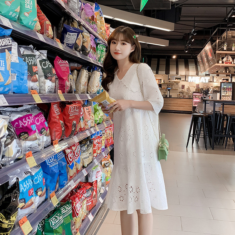 白色娃娃领中长款连衣裙夏装新款修身A字裙气质蕾丝连衣裙女