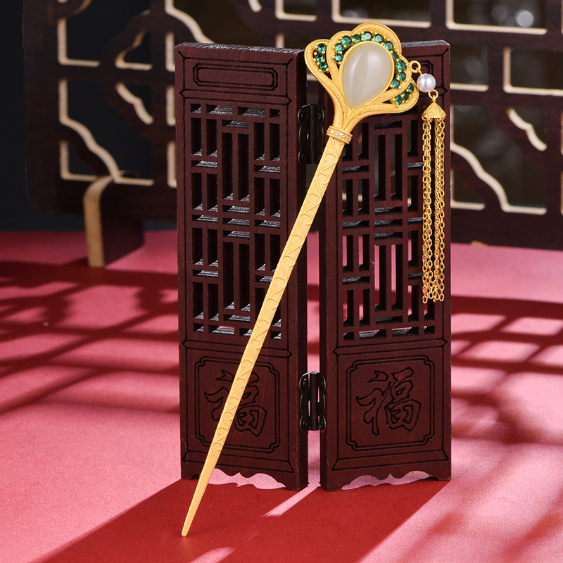 S925纯银镶嵌和田玉发簪宫廷古风国潮发饰簪子