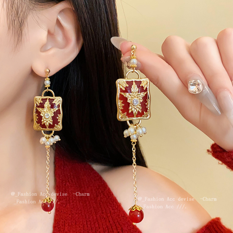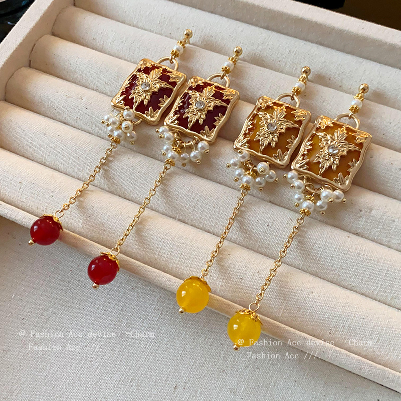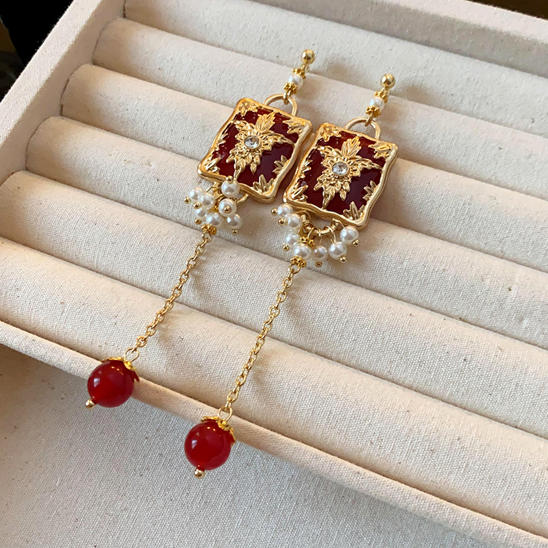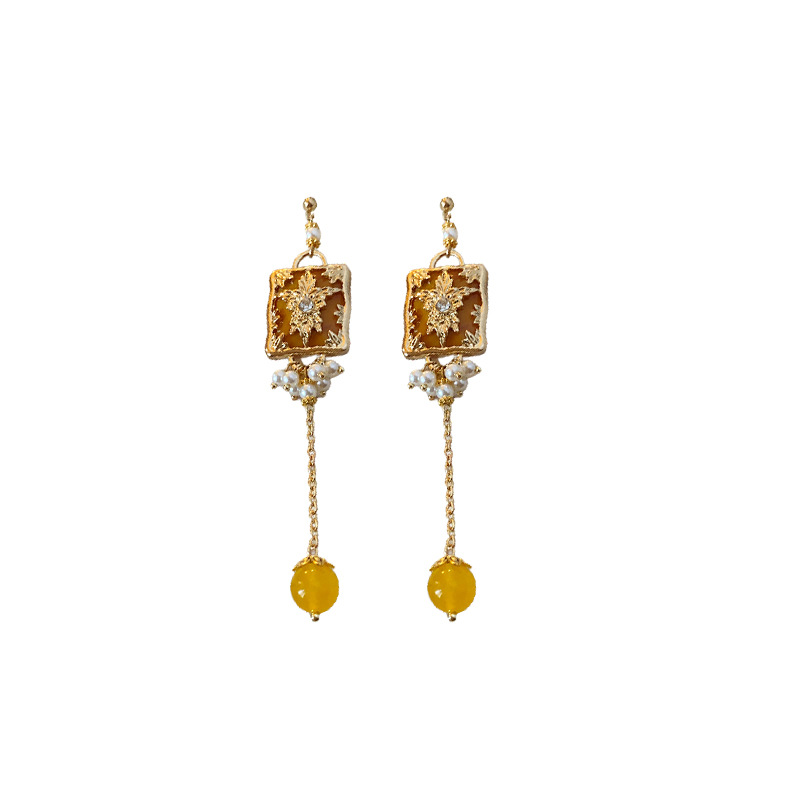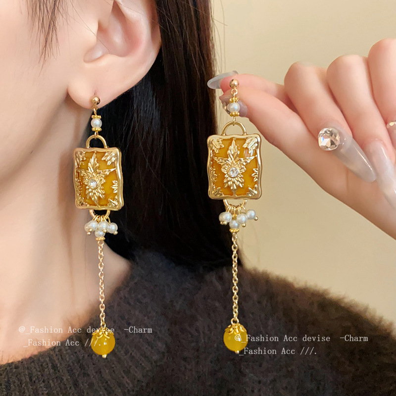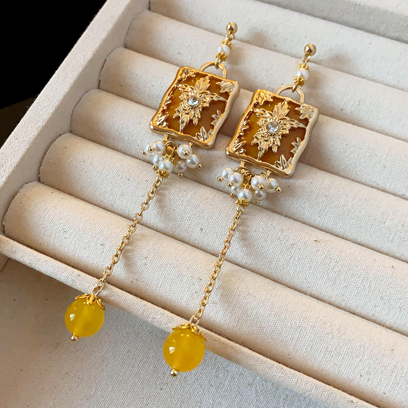 中古vintage饰品银针镶钻花朵人造珍珠耳环复古时尚长款耳饰