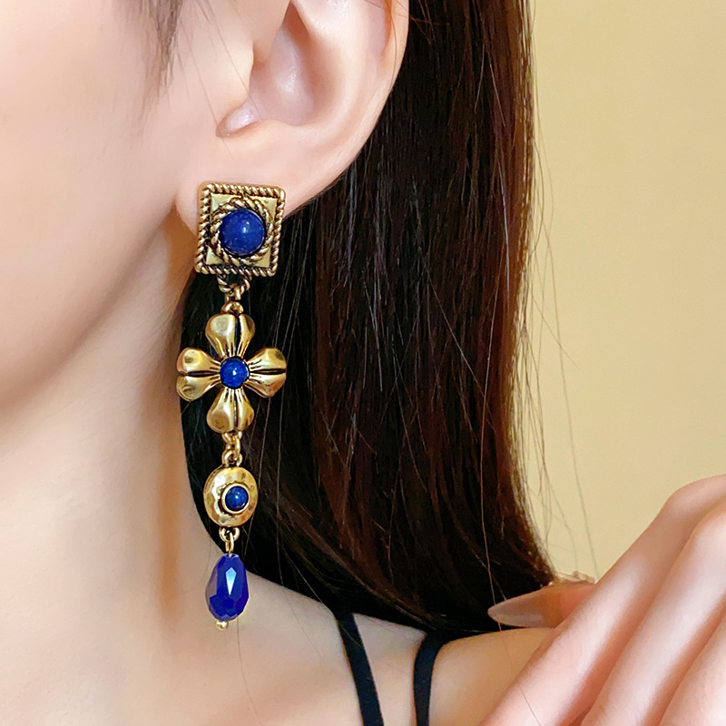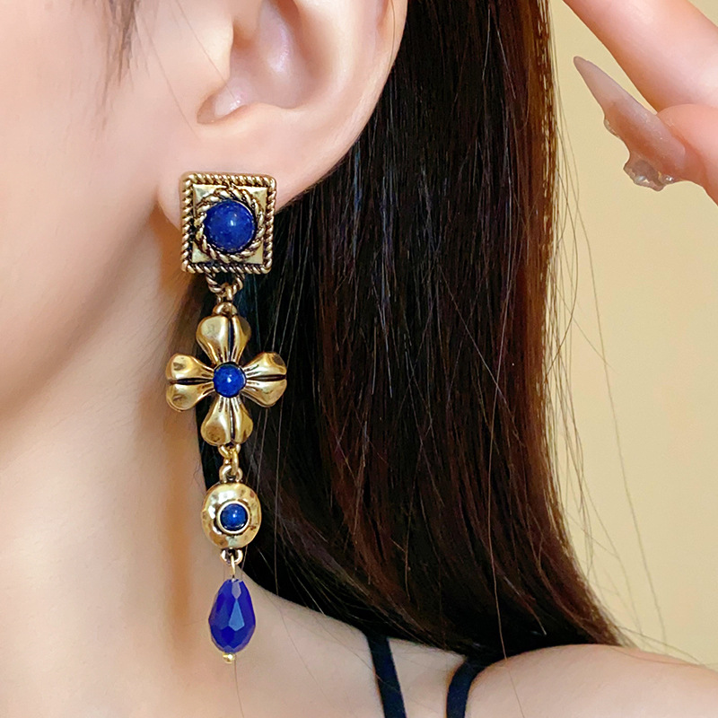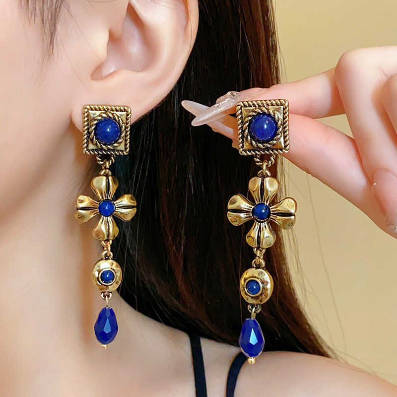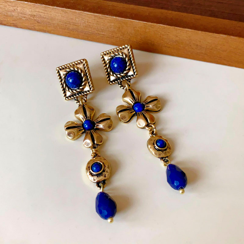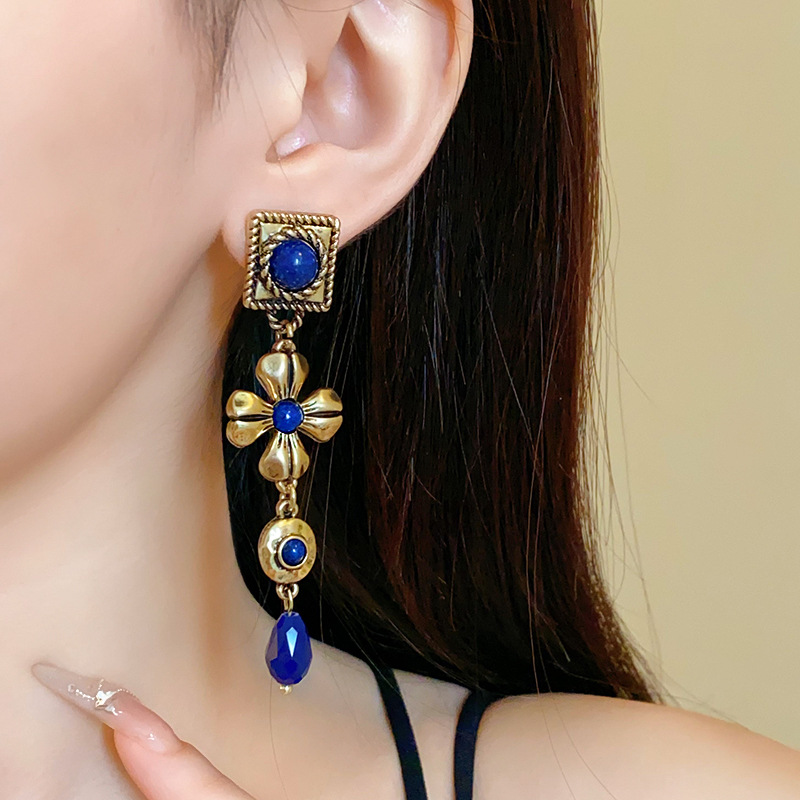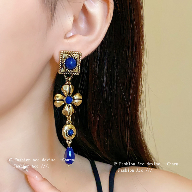 中古vintage耳环银针方形花朵水滴长款耳坠宫廷风复古气质耳饰女