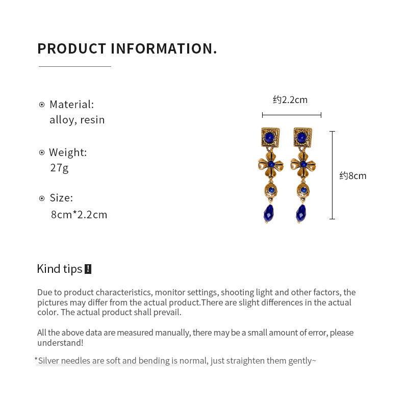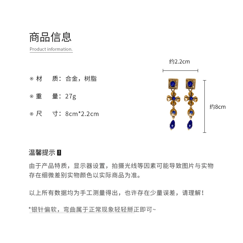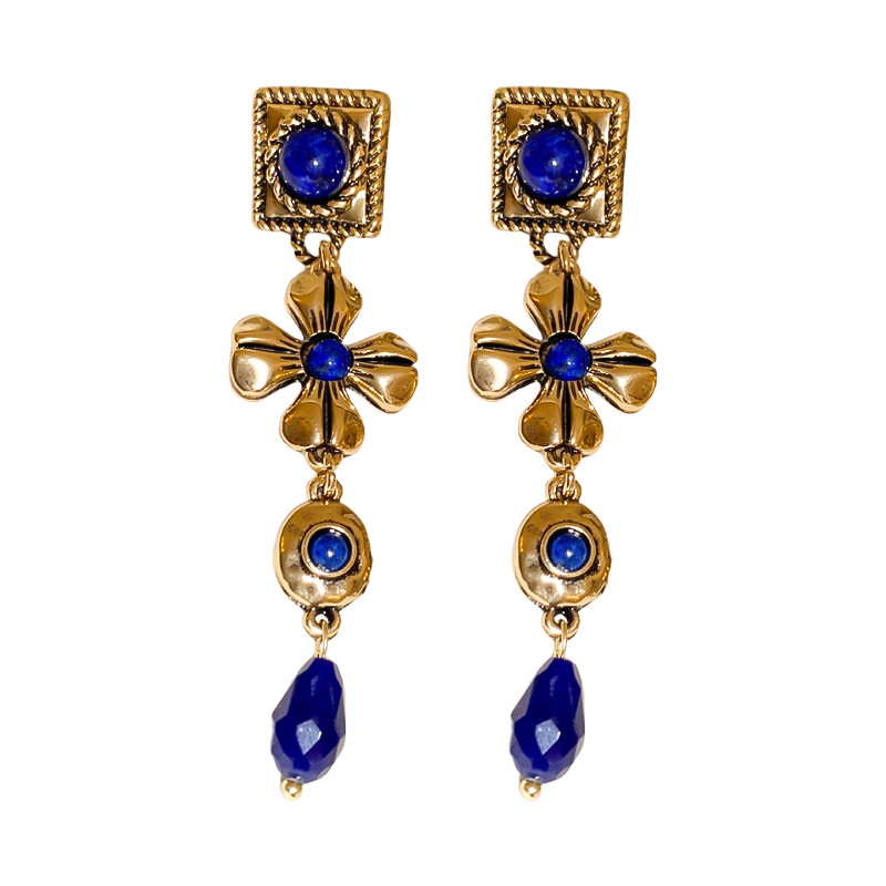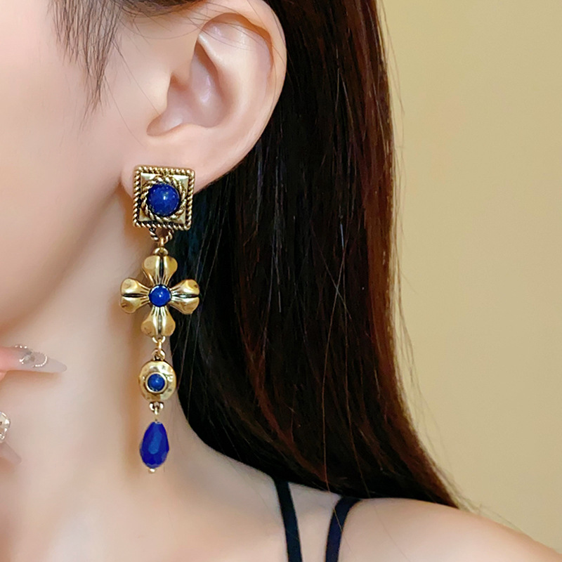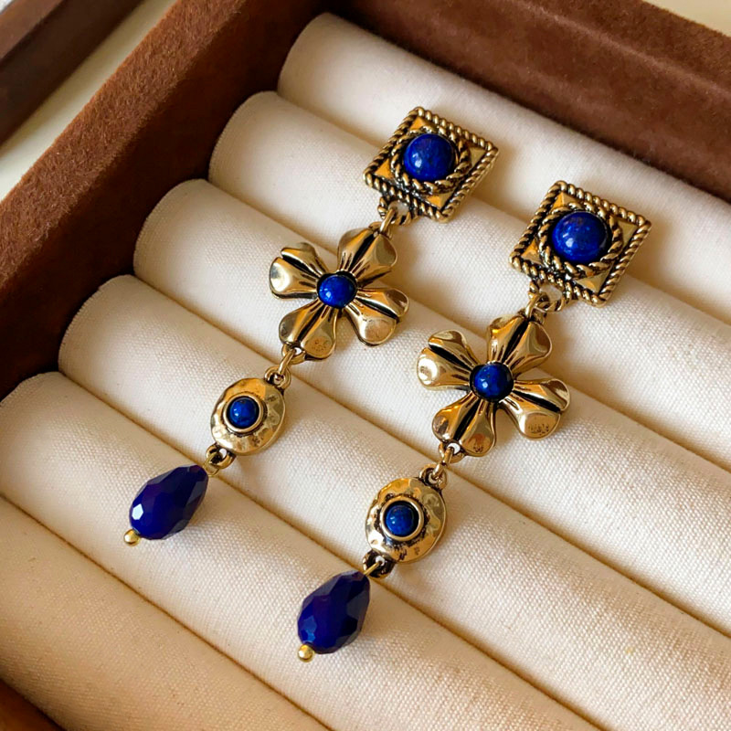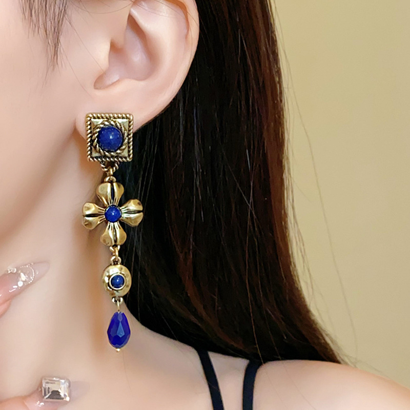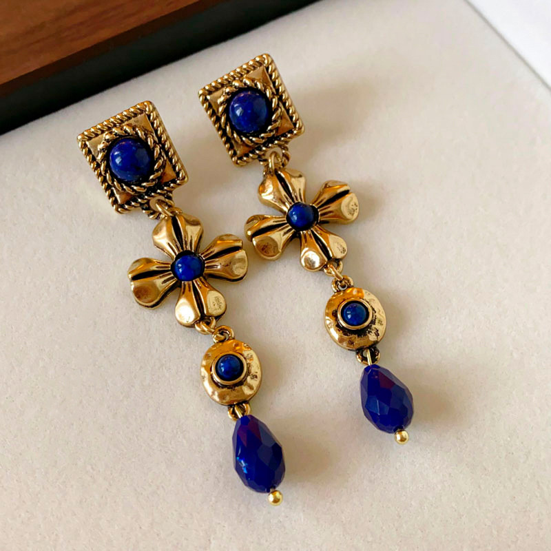 中古vintage耳环银针方形花朵水滴长款耳坠宫廷风复古气质耳饰女