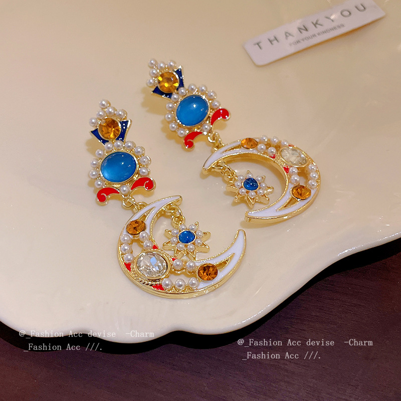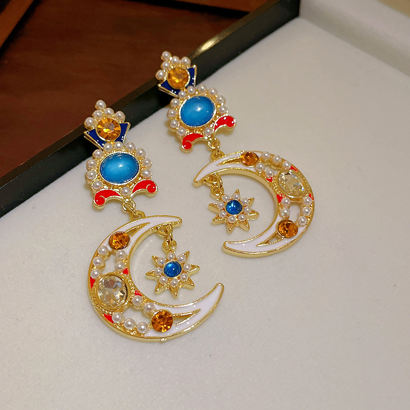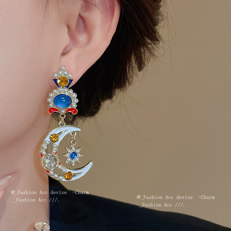 vintage中古银针镶钻滴油星月耳环人造珍珠耳坠宫廷风气质耳饰女