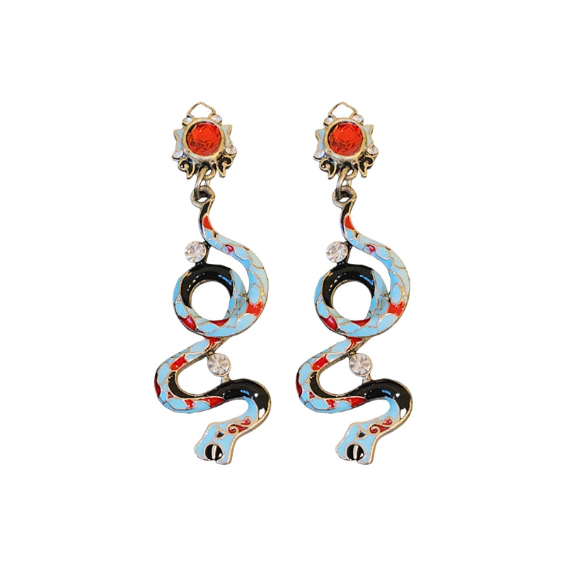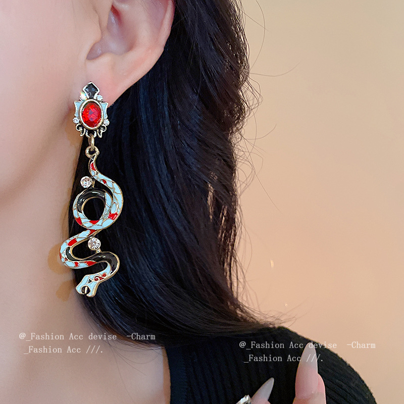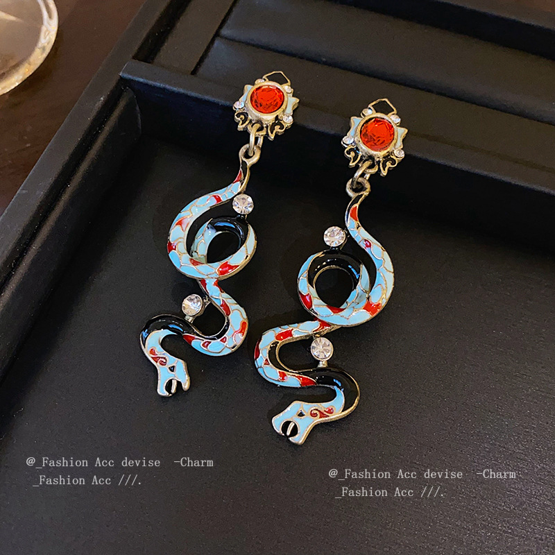 vintage中古银针滴油镶钻小蛇耳环宫廷风复古设计耳坠高级感饰品