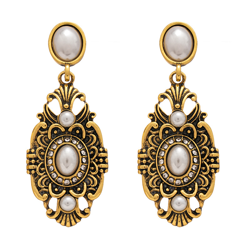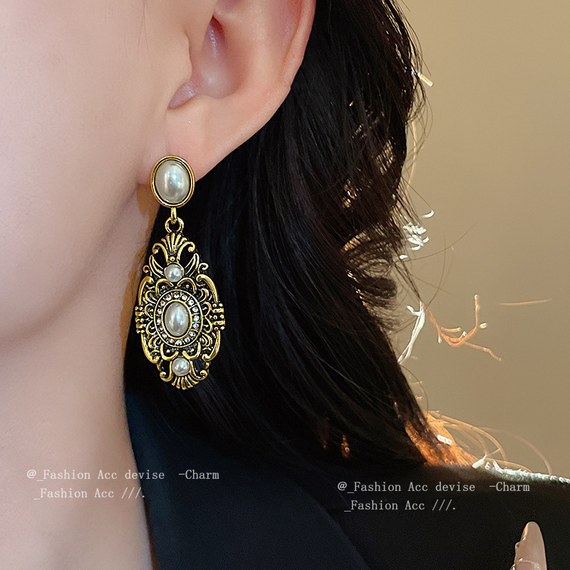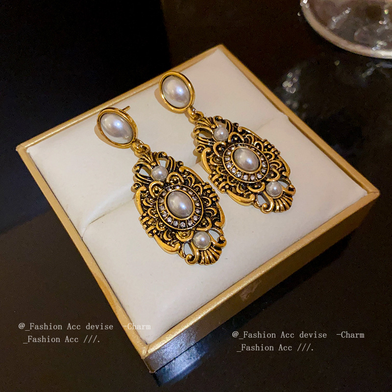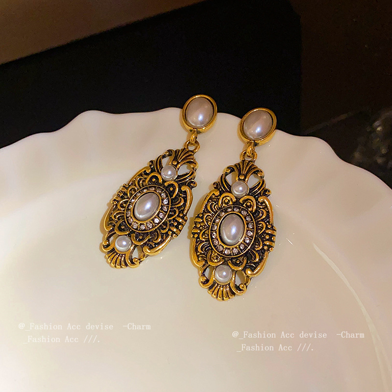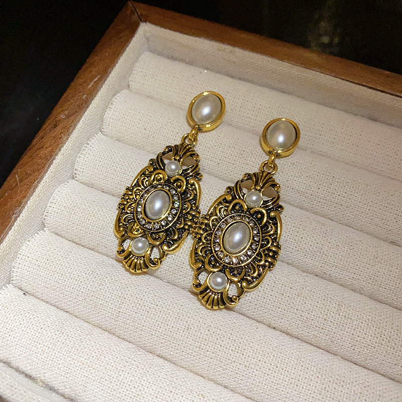 中古vintage银针镶钻人造珍珠耳环高级感宫廷风耳坠设计耳饰