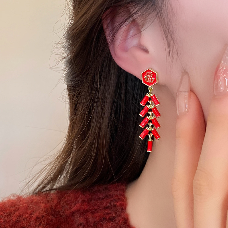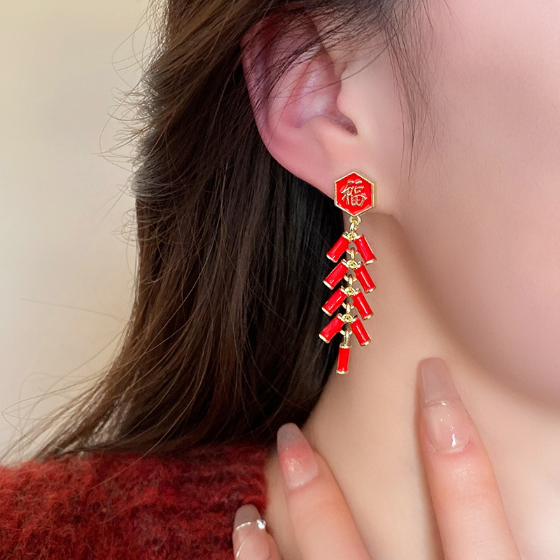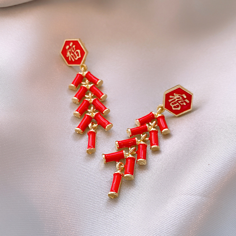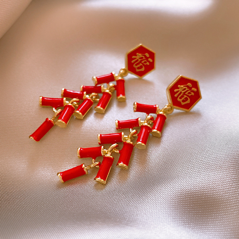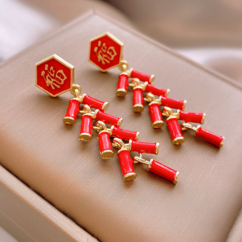 中国风新年滴油福字鞭炮流苏银针耳环过年喜庆个性创意气质耳饰女