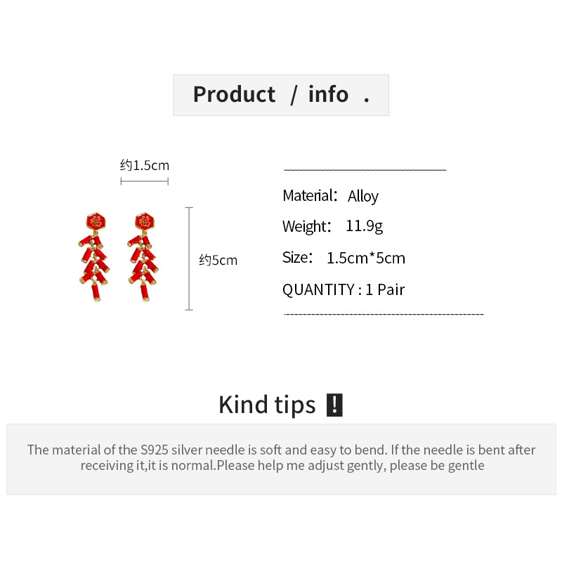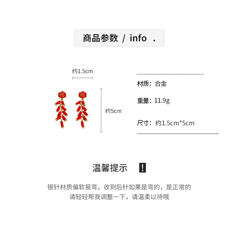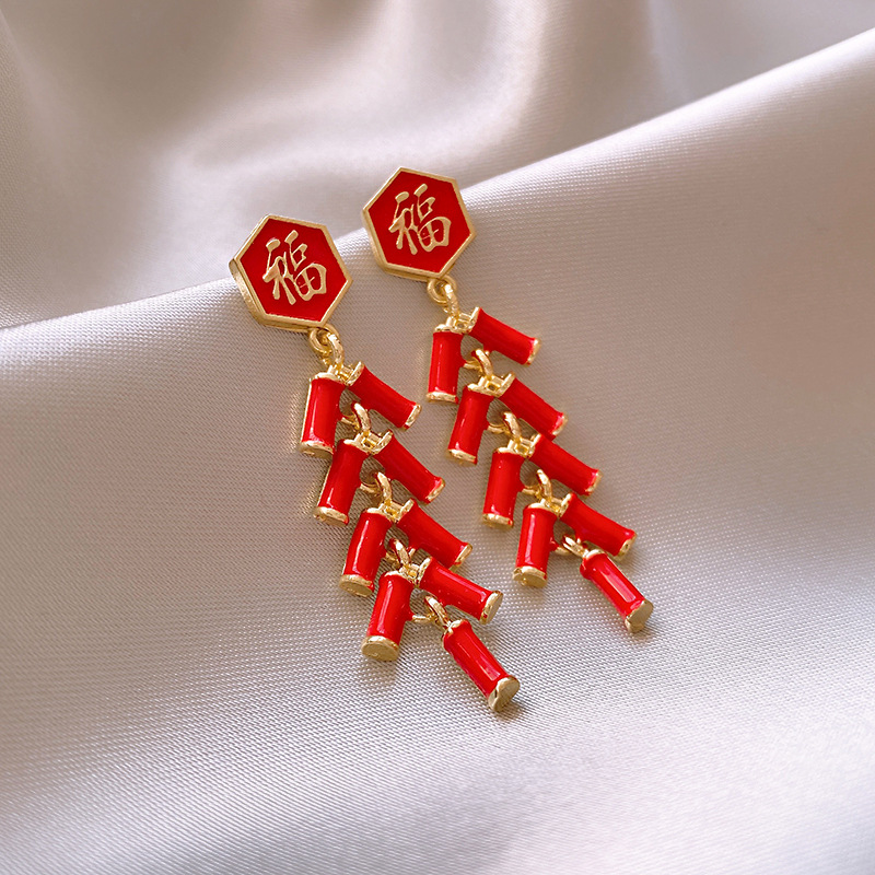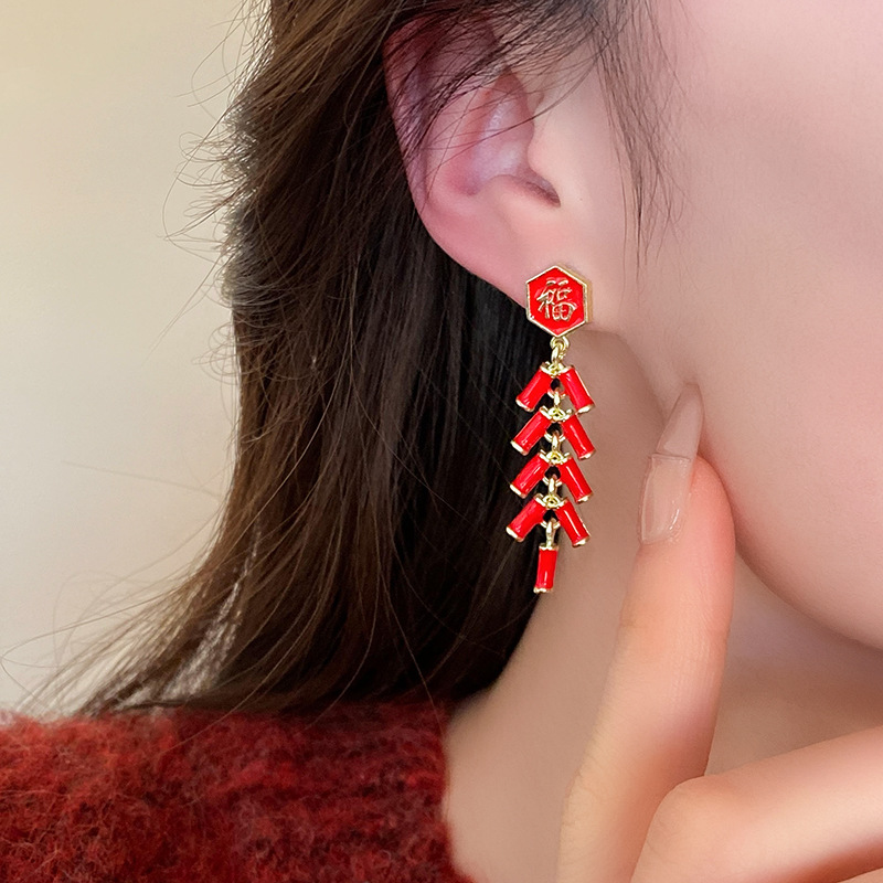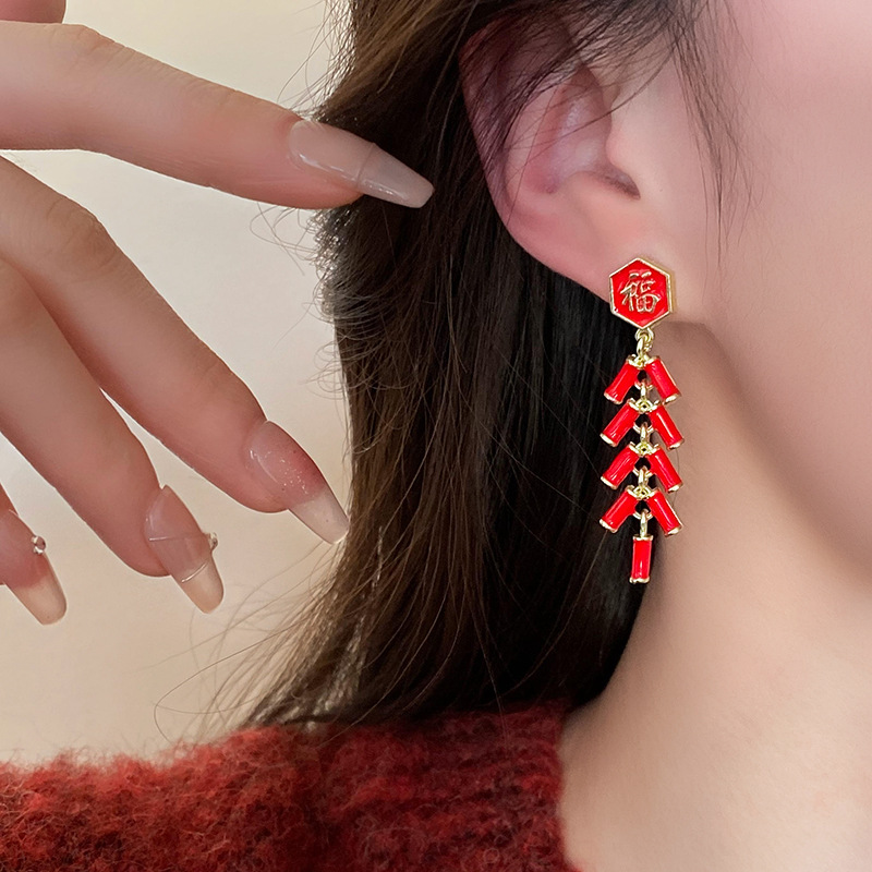 中国风新年滴油福字鞭炮流苏银针耳环过年喜庆个性创意气质耳饰女