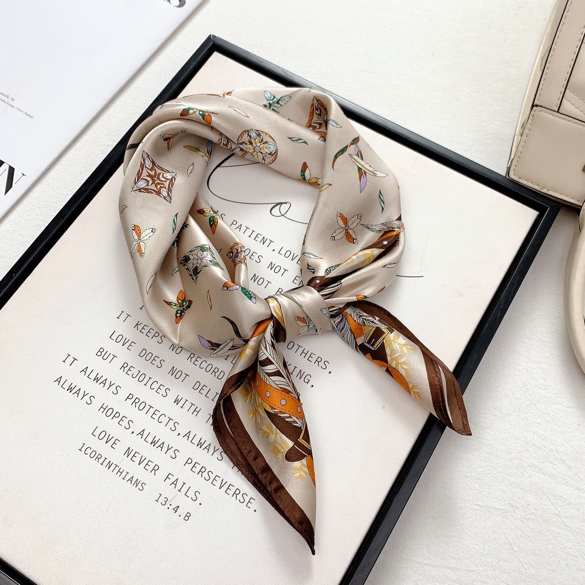 丝绸香槟色羽毛花卉真丝丝巾时尚印花100%桑蚕丝70方巾