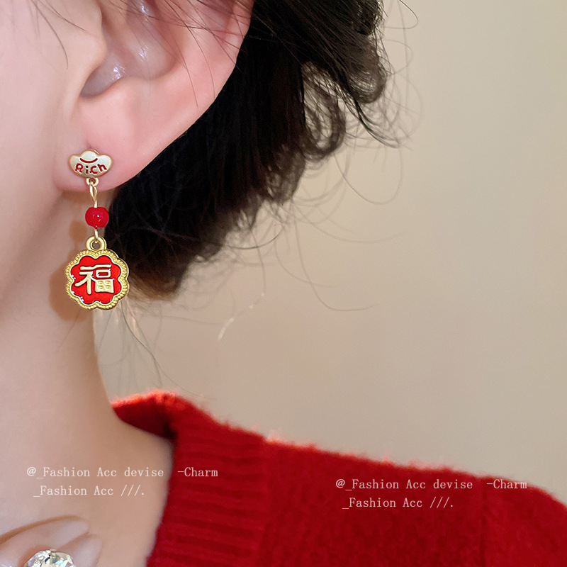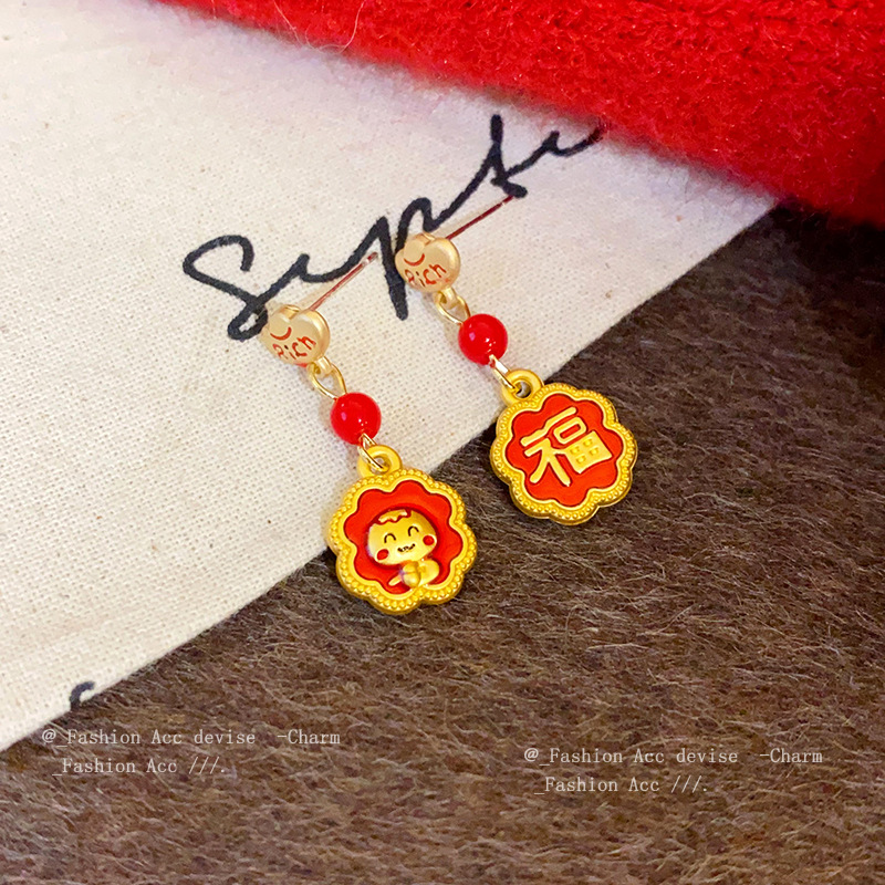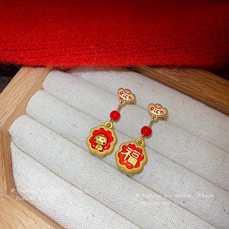 银针滴油元宝福字花朵吊坠耳钉女本命年红色喜庆耳环新年百搭耳饰