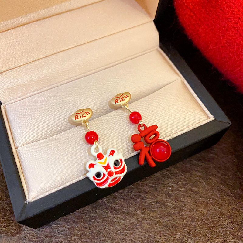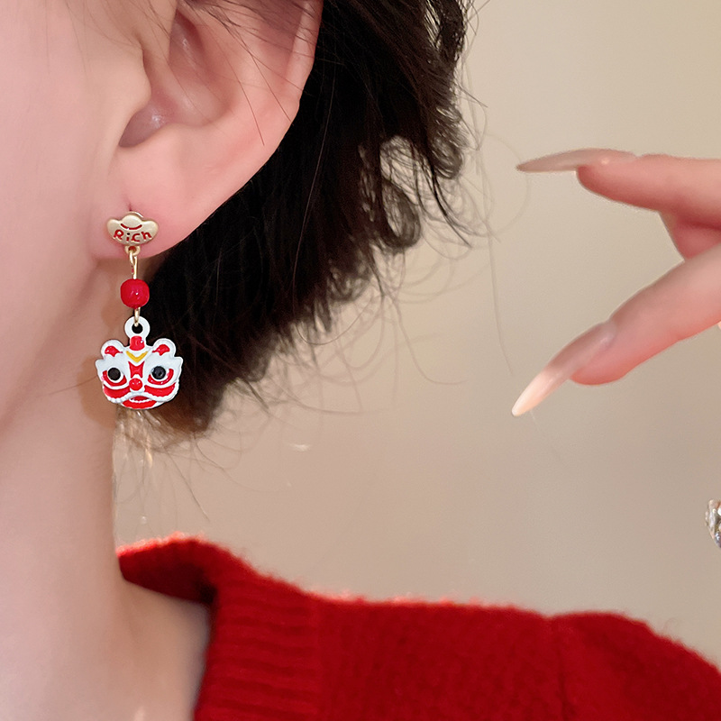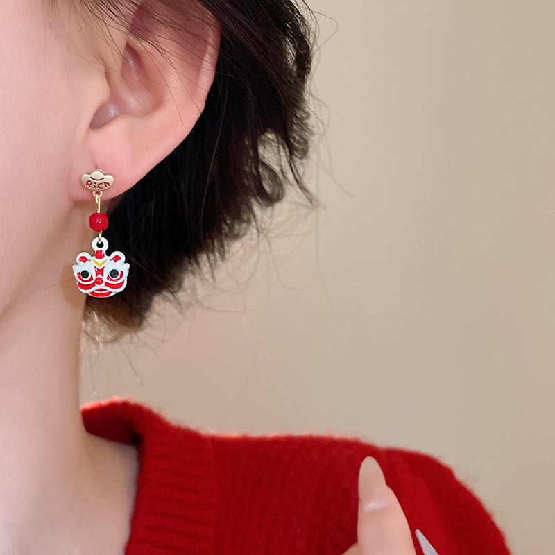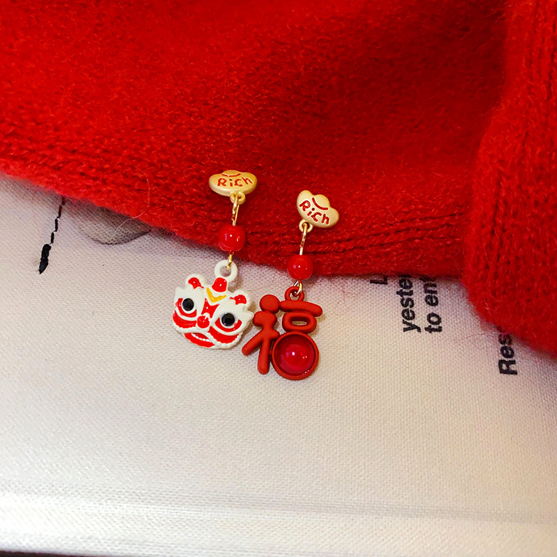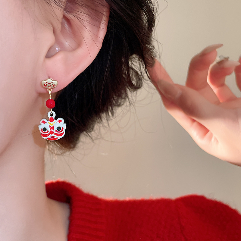 银针滴油元宝醒狮福字吊坠耳钉时尚红色喜庆耳环气质百搭新年耳饰