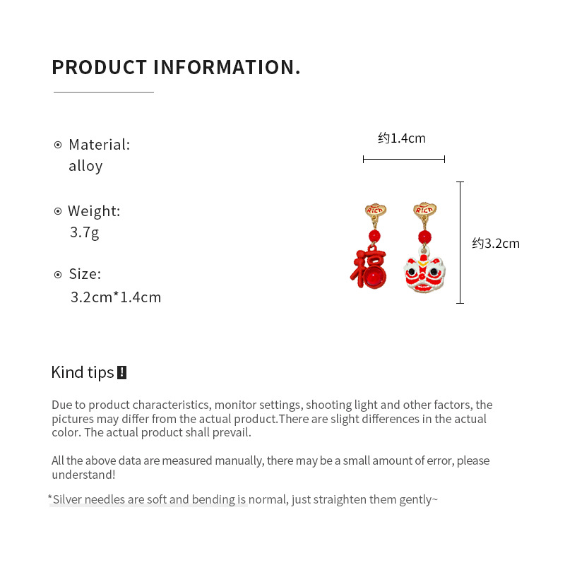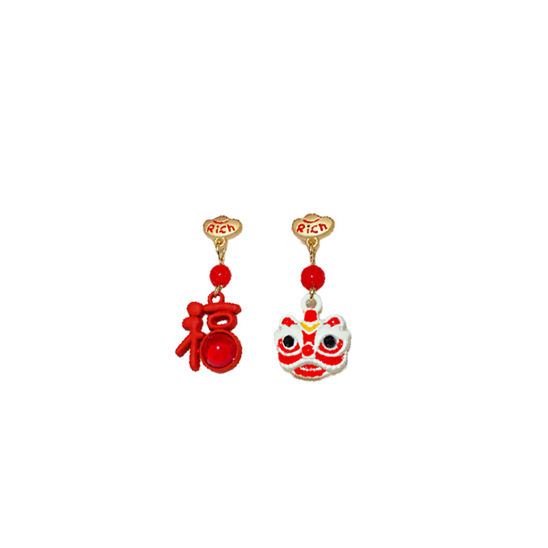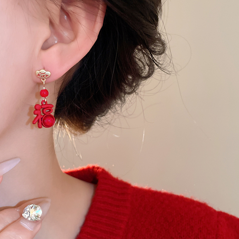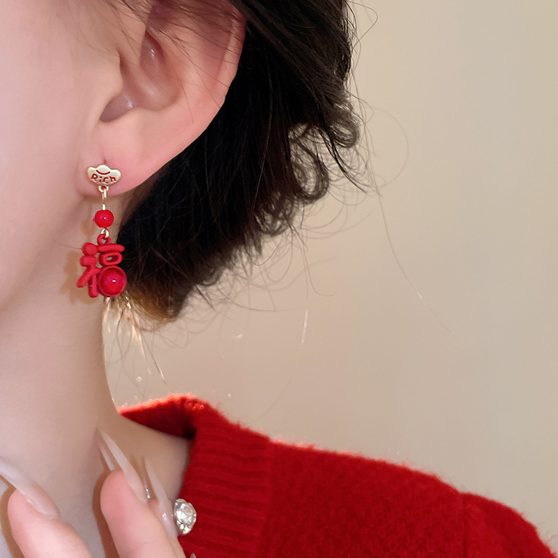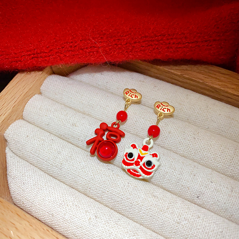 银针滴油元宝醒狮福字吊坠耳钉时尚红色喜庆耳环气质百搭新年耳饰