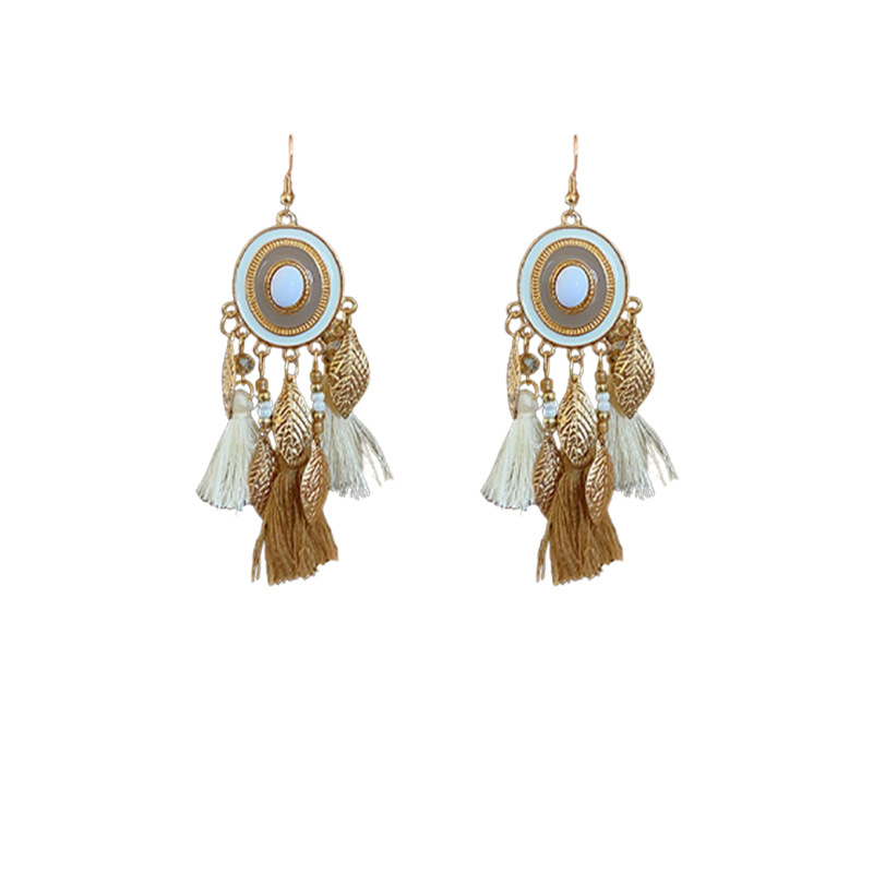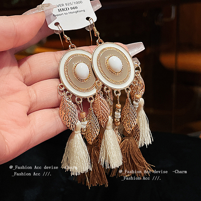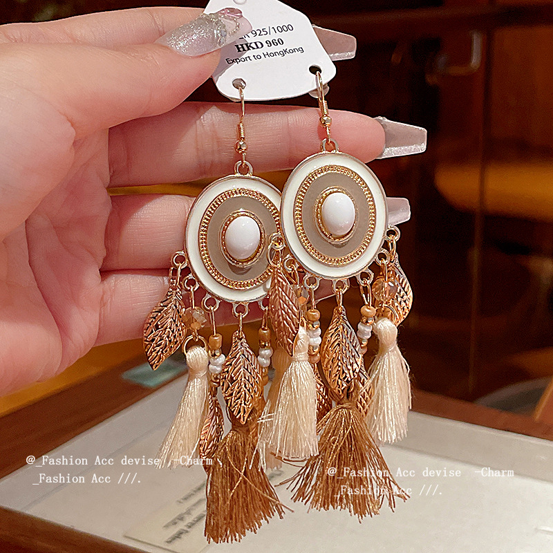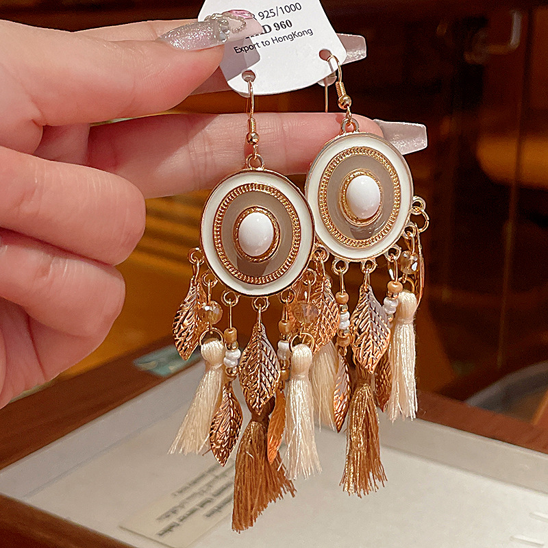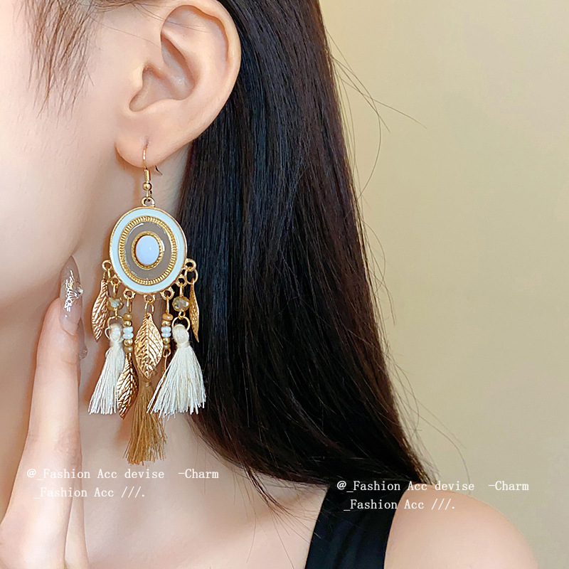 圆形滴油树叶水晶流苏耳钩波西米亚民族风长款耳环高级感复古耳饰