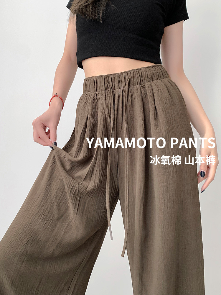 棕色冰丝女夏季薄款高腰休闲百搭直筒小个子棉麻防晒褶皱山本