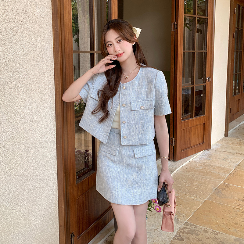 夏季小香风网红短袖套装小个子高级感气质名媛包臀裙两件套女