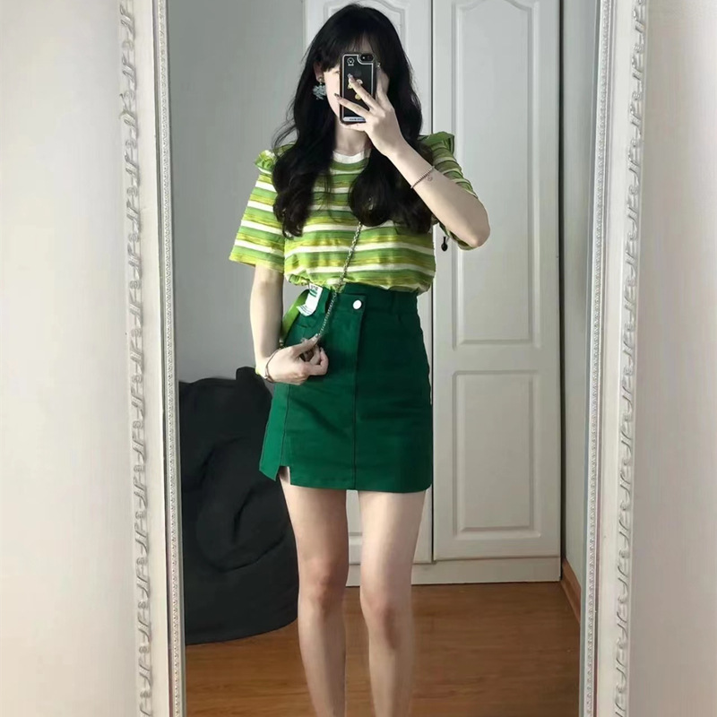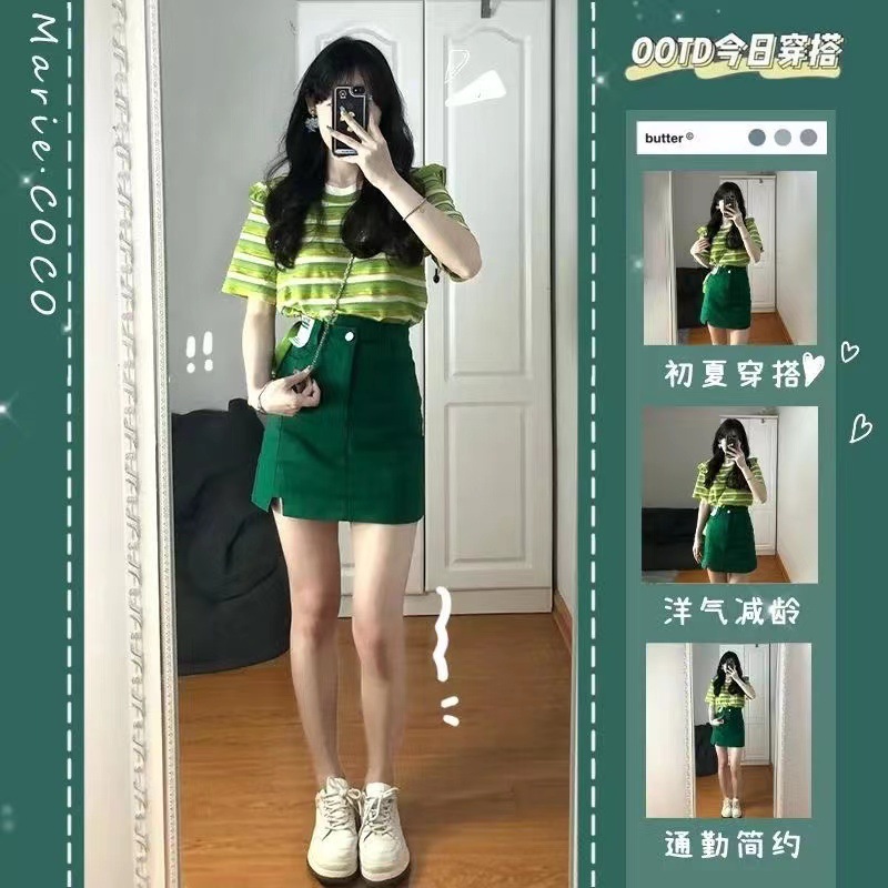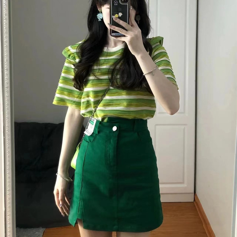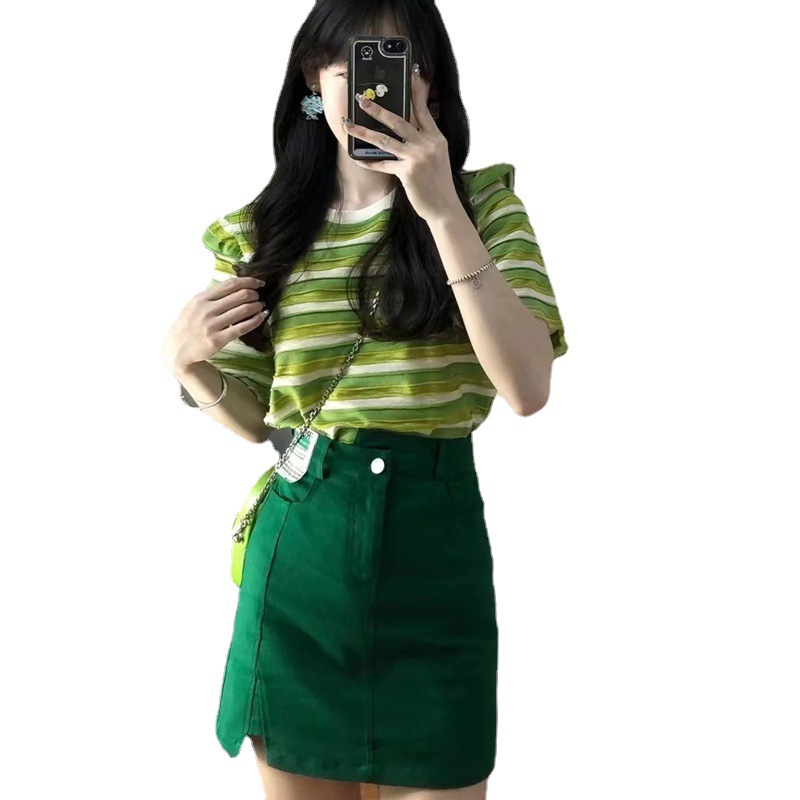 夏季新款小个子俏皮女装活泼套装时尚条纹圆领T恤短裙两件套