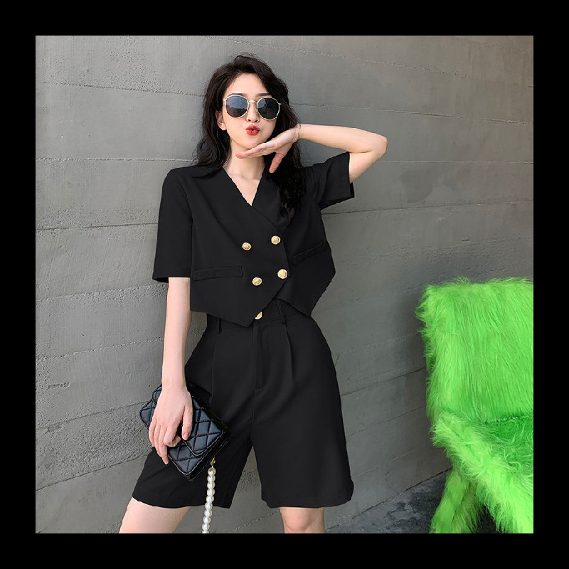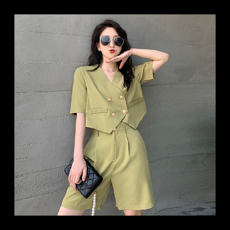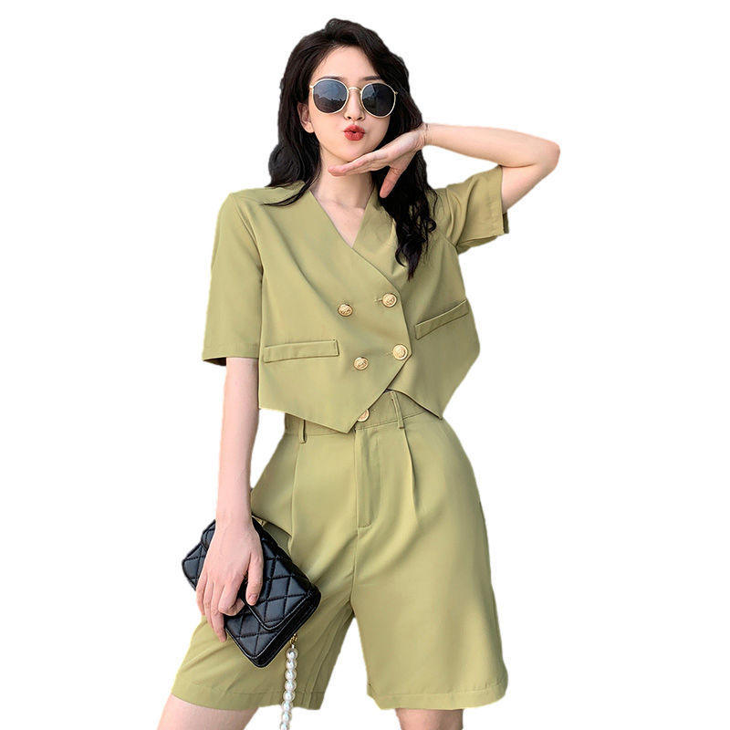 芥末绿盐甜系西装短裤阔腿裤套装女夏休闲时尚小香风两件套小个子