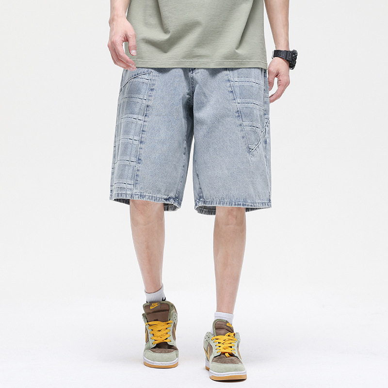夏款潮牌美式高街休闲提花牛仔短裤男宽松大码五分裤大方格棉