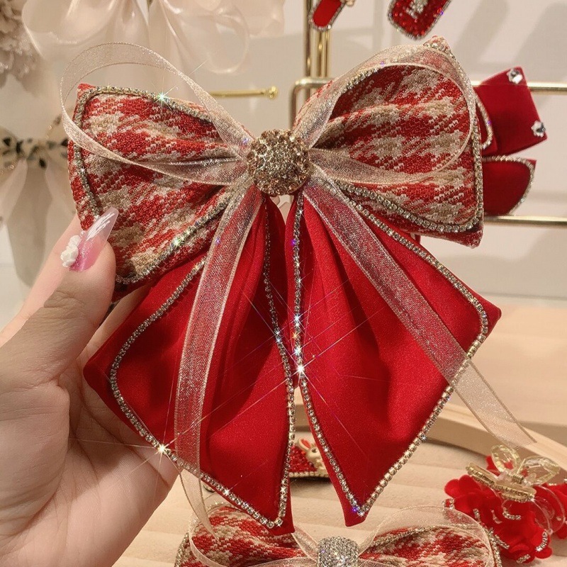 ins超仙新款千鸟格雪纺甜美潮流大气蝴蝶结气质感弹簧夹婚礼发饰