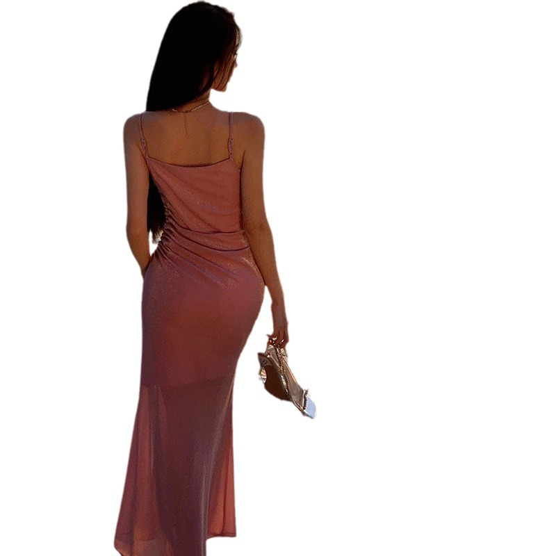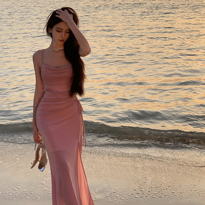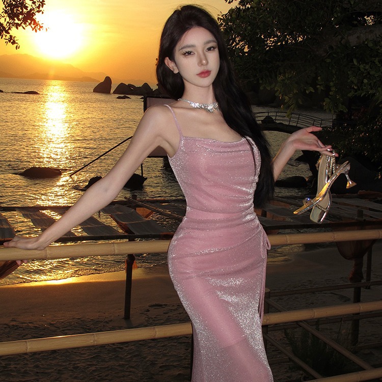 度假月粉法式针织吊带连衣裙气质显瘦高级感年会party晚礼服女夏