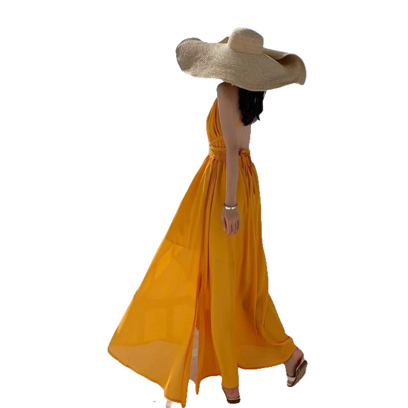沙滩裙新款女夏超仙黄色露背连衣裙海边度假长裙飘逸大摆海岛裙子