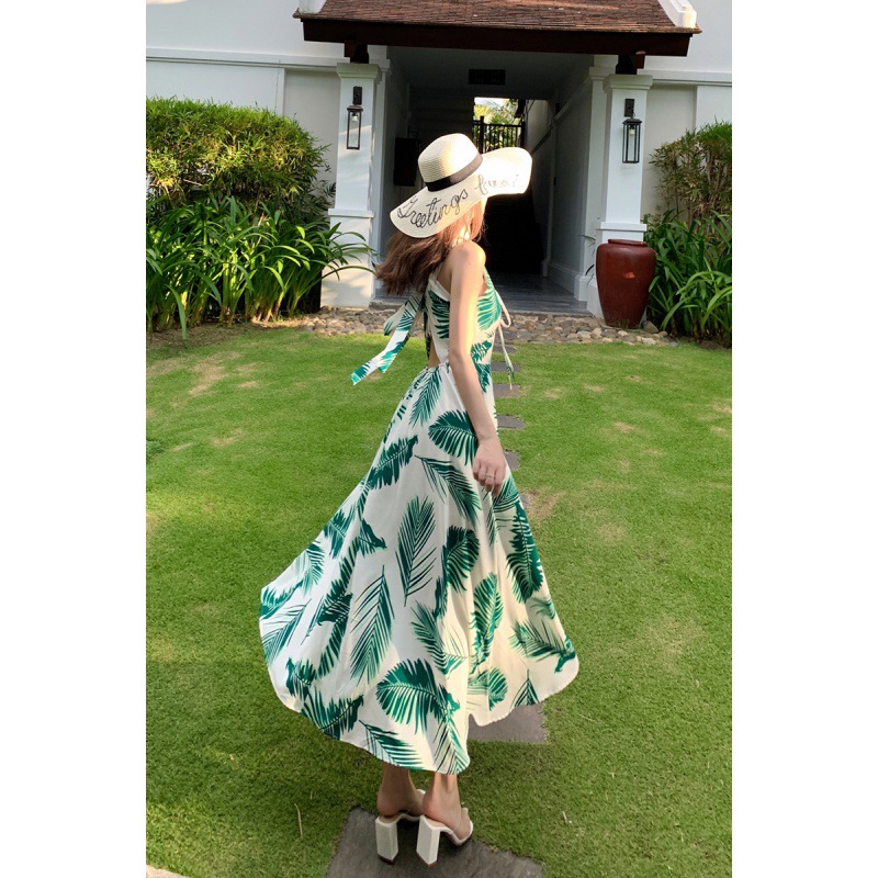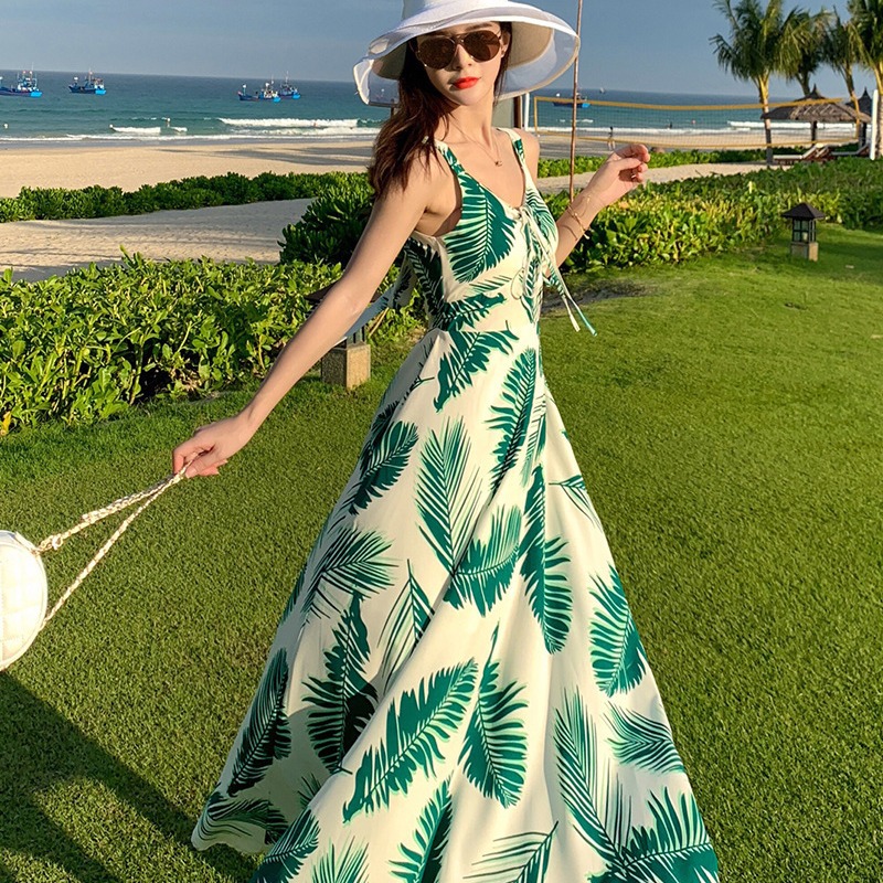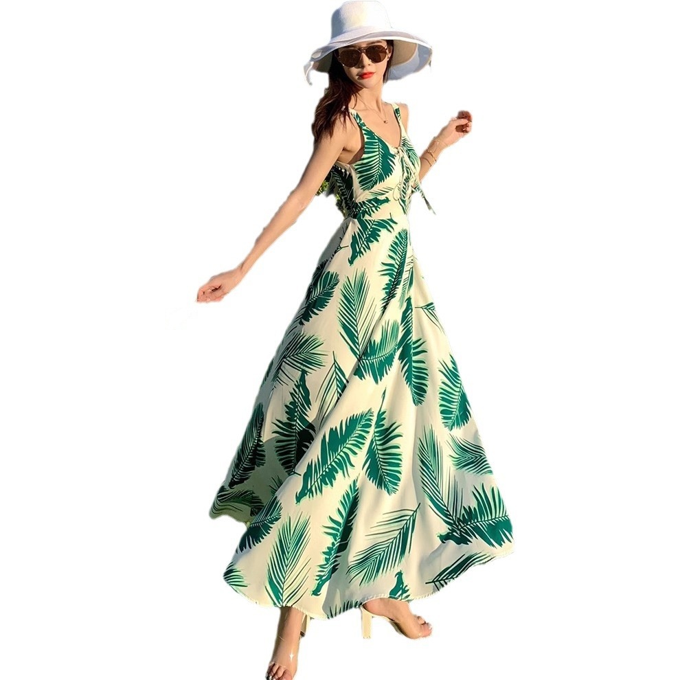 夏季新款绿叶子胸围可调节海滩巴厘岛沙滩裙旅游度假风连衣裙子女
