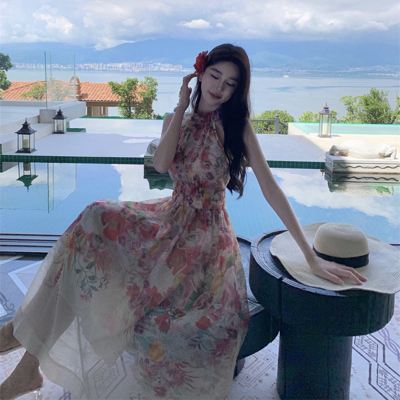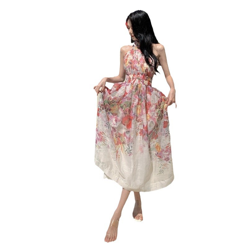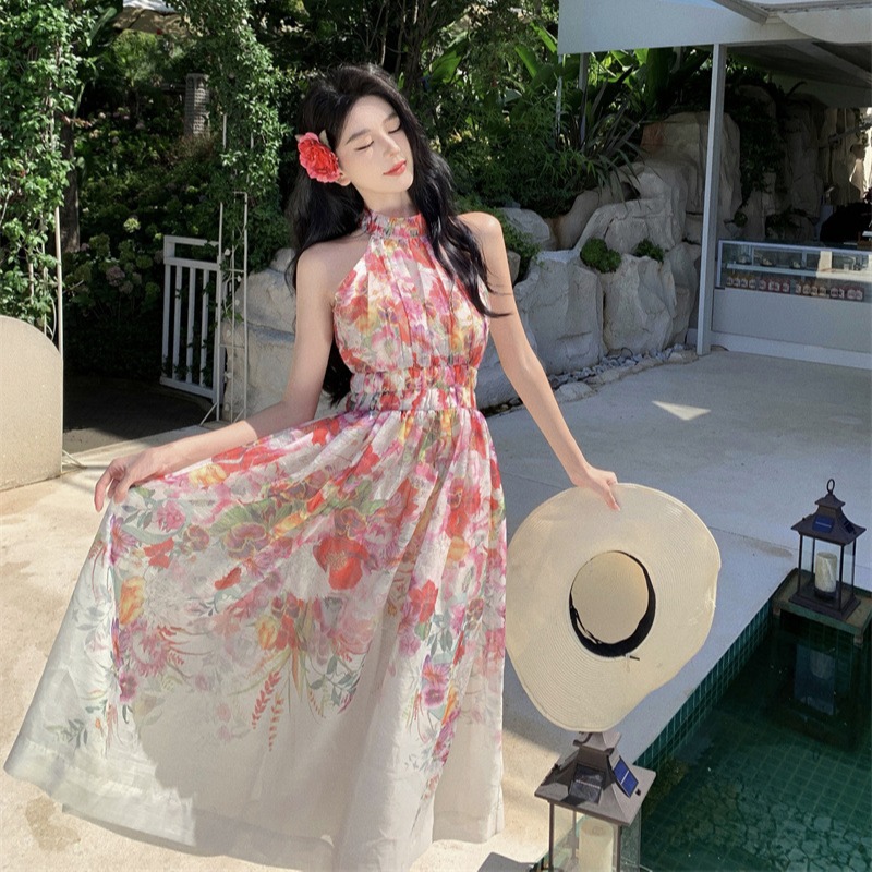 定位花法式复古高级感印花无袖挂脖长裙女气质大摆显瘦连衣裙裙子