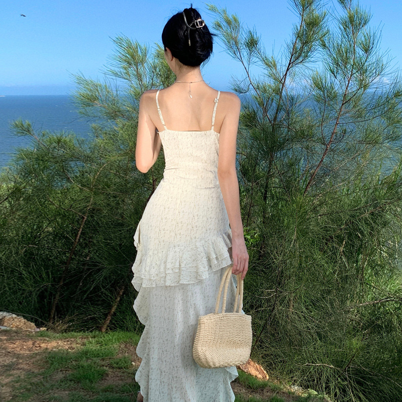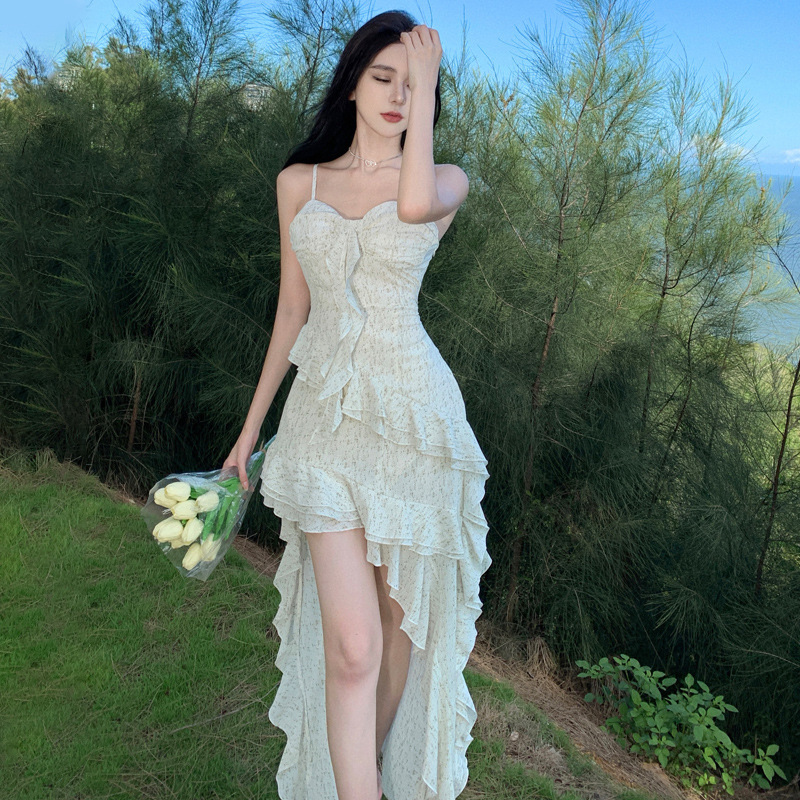 辣妹荷叶边吊带连衣裙仙女夏季白色裙子重工高级感不规则气质长裙