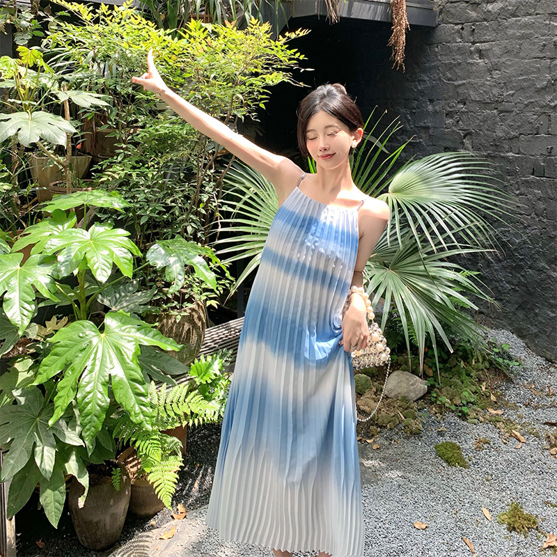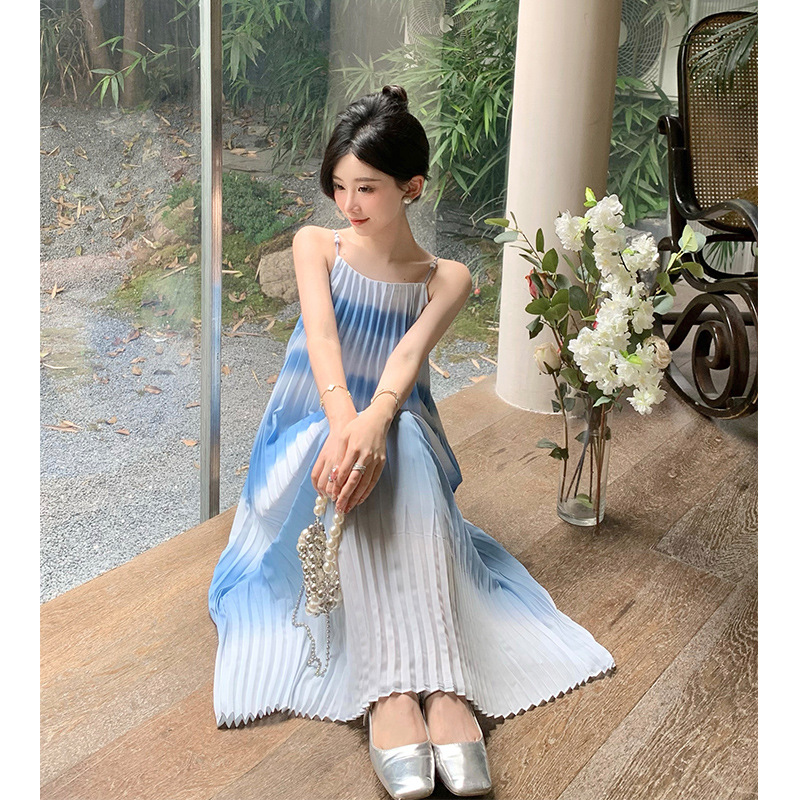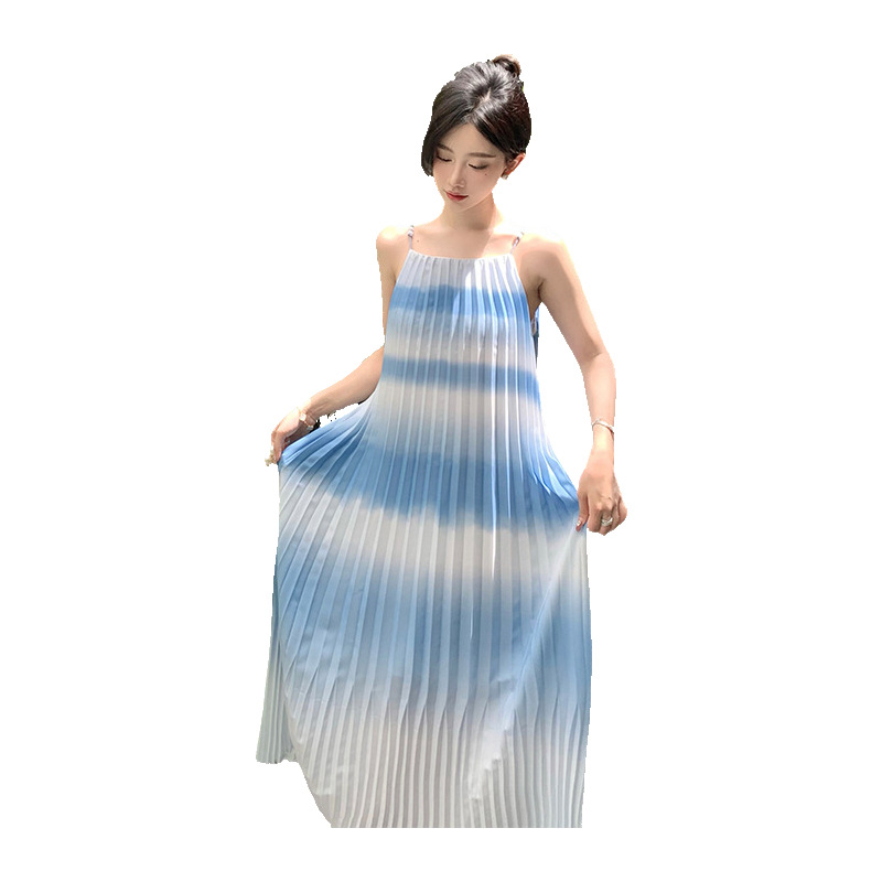 实拍法式蓝色渐变吊带连衣裙女夏季新款海边度假裙子海浪裙海岛裙