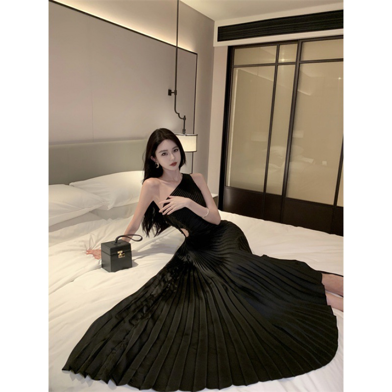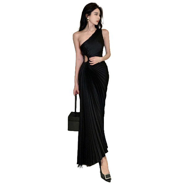 轻奢名媛风单肩腰镂空百褶修身显瘦连衣裙法式设计露肩party礼服
