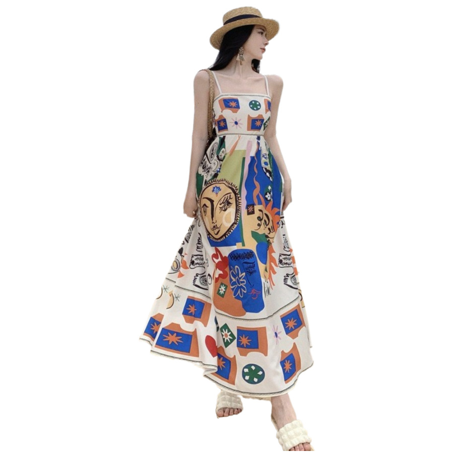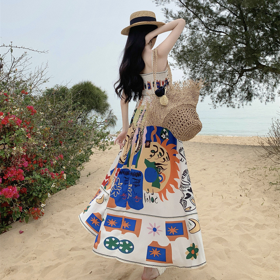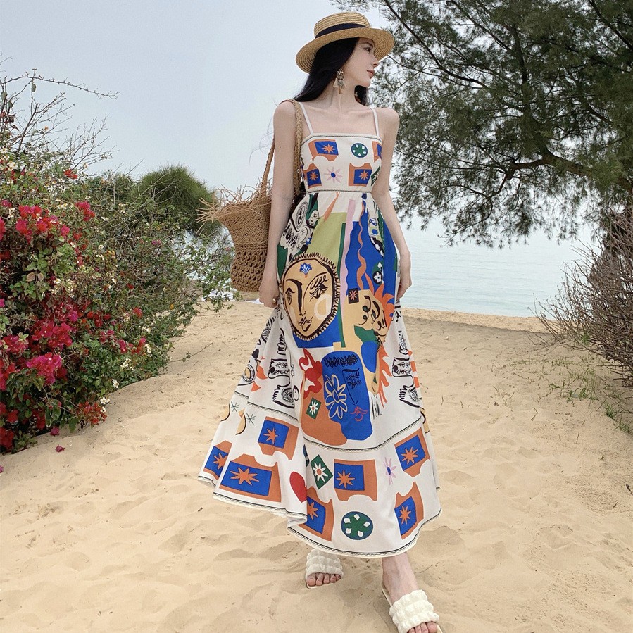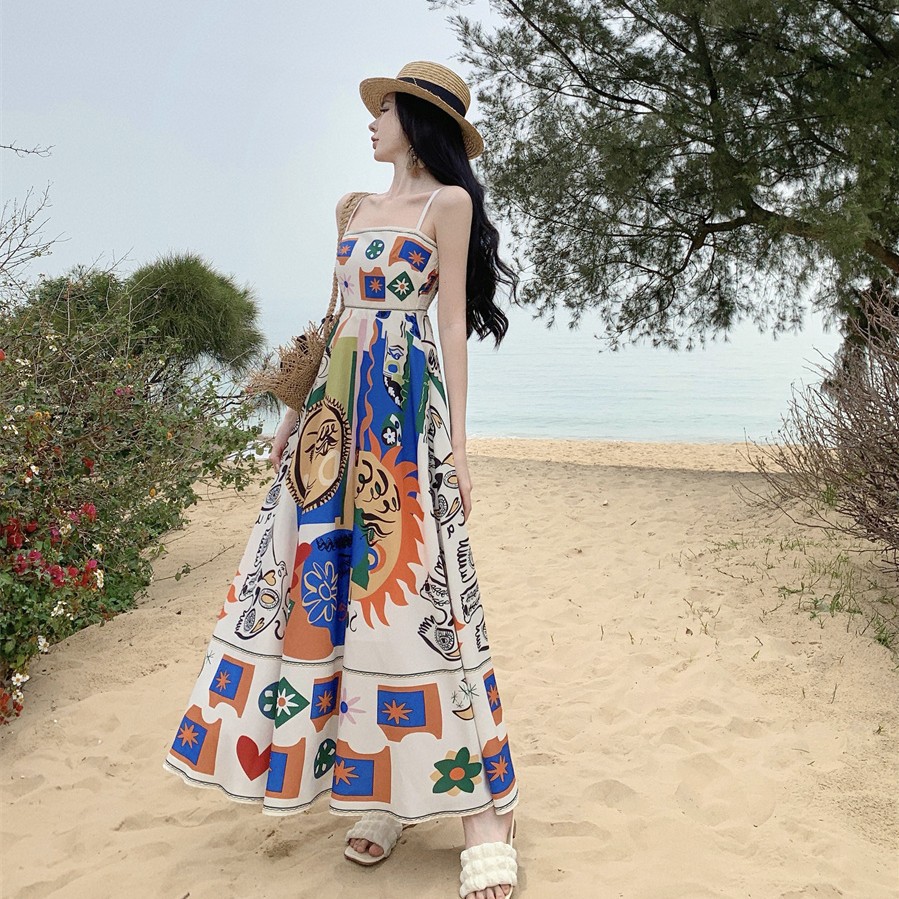泰式彩色印花一字肩无袖沙滩长裙海边度假显瘦抹胸吊带连衣裙女夏