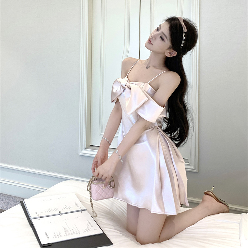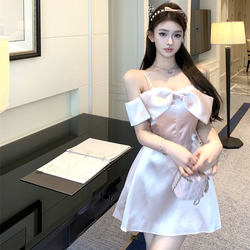 实拍一字肩抹胸连衣裙女成人礼礼服粉色蝴蝶结生日裙子公主蓬蓬裙