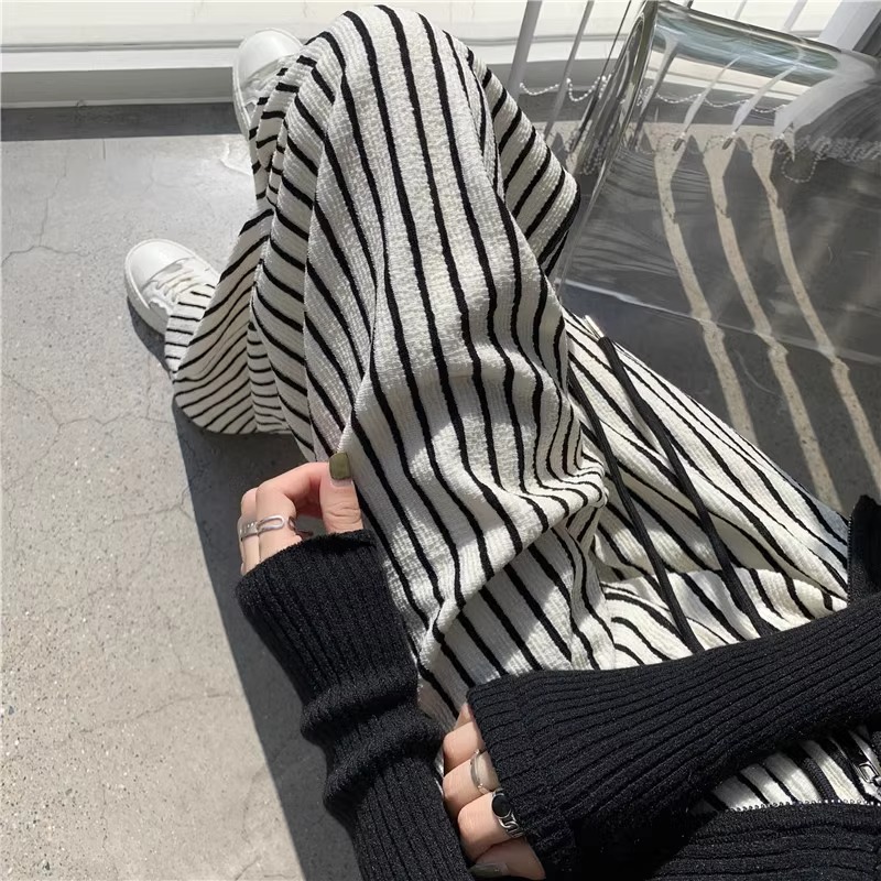 肌理感软糯毛巾裤女春季新款黑白条纹裤子女慵懒风宽松垂感阔腿裤
