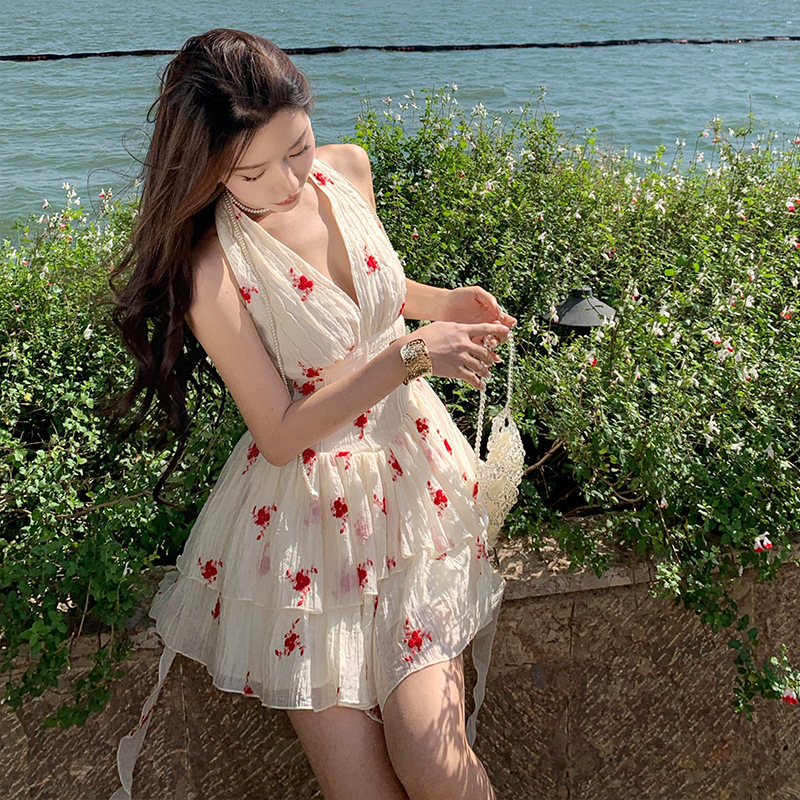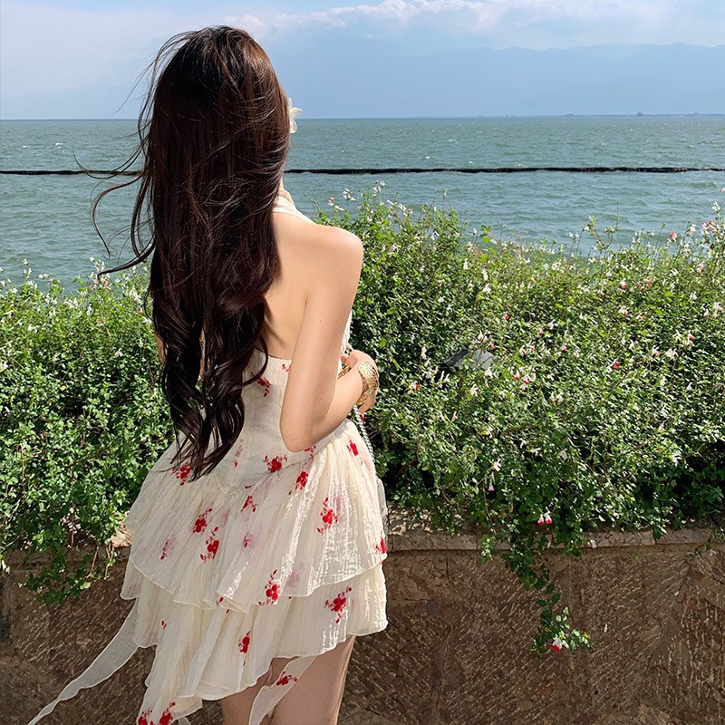纯欲风挂脖碎花连衣裙女夏季收腰显瘦短裙海岛沙滩度假风穿搭裙子