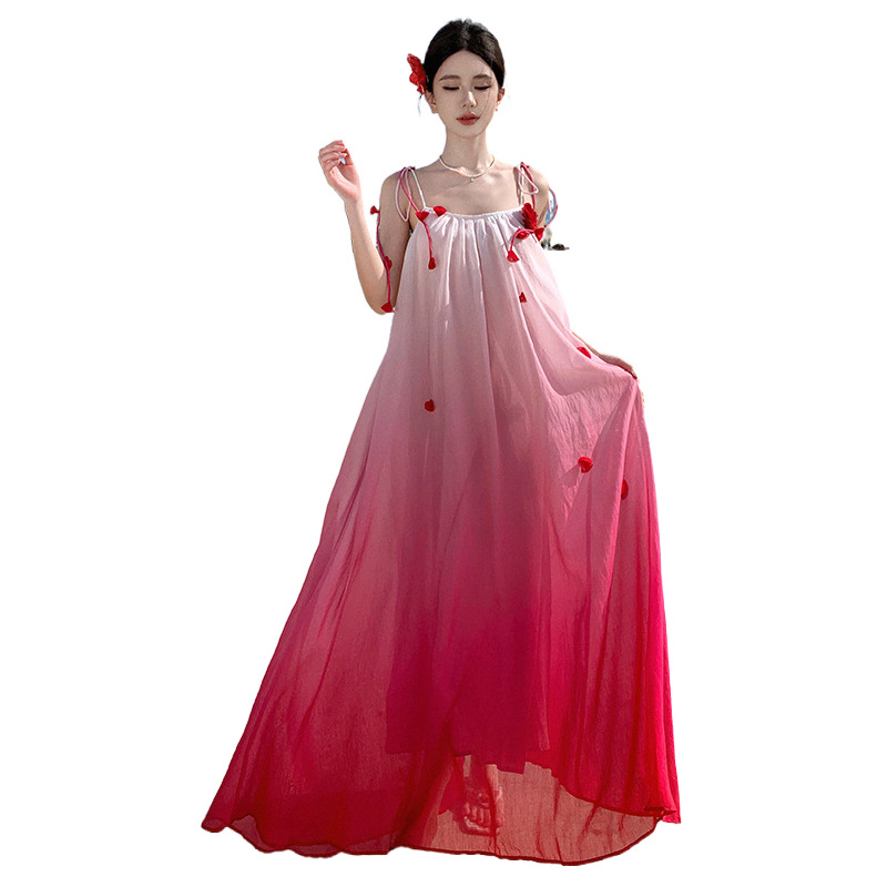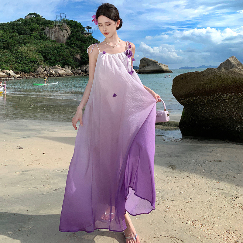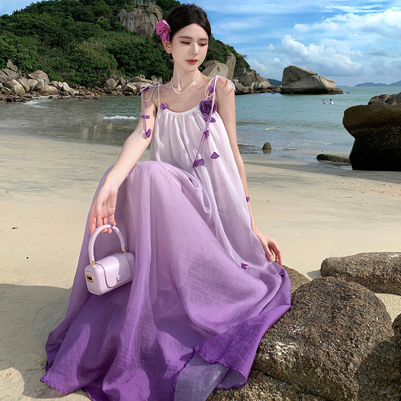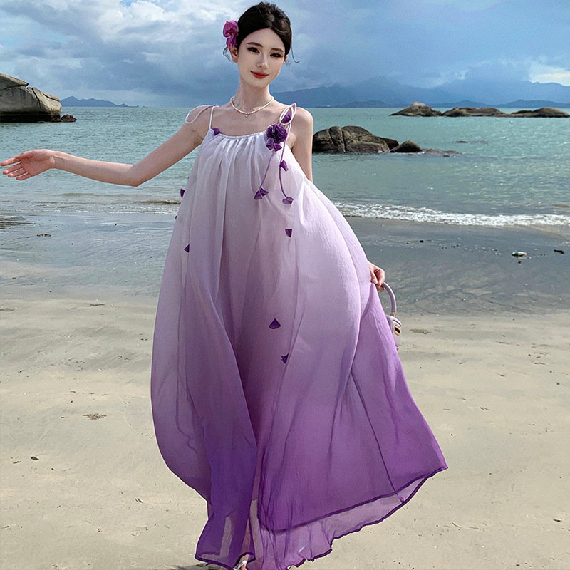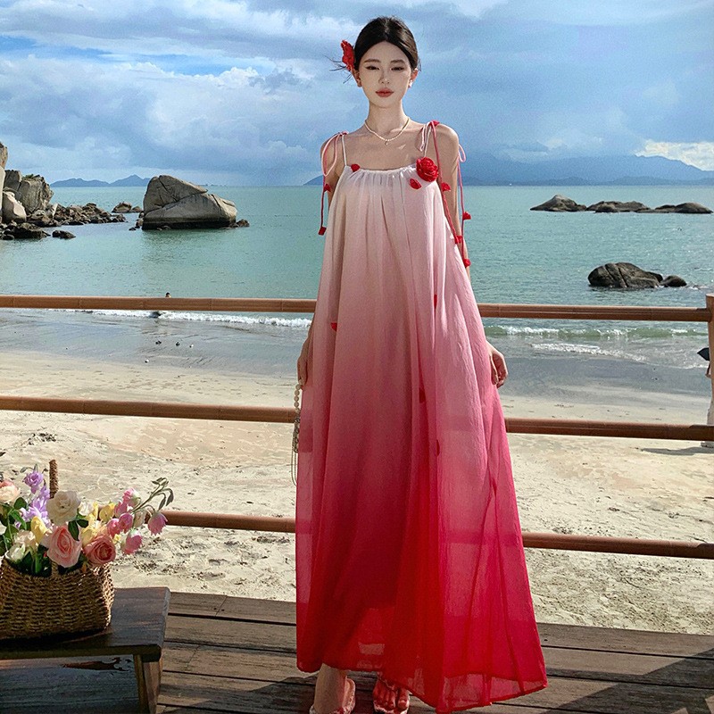 渐变立体花朵超仙好看出游度假裙子宽松吊带连衣裙海岛穿搭沙滩裙
