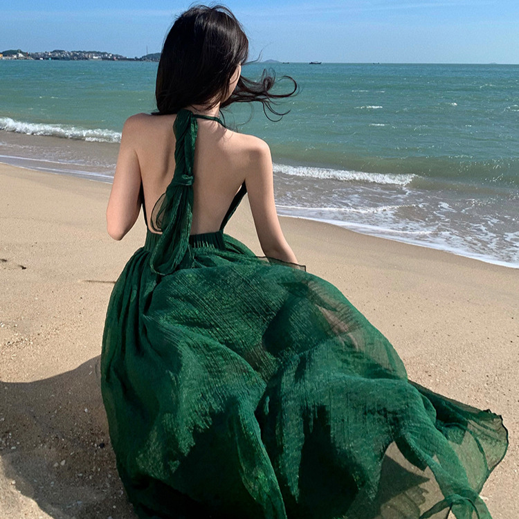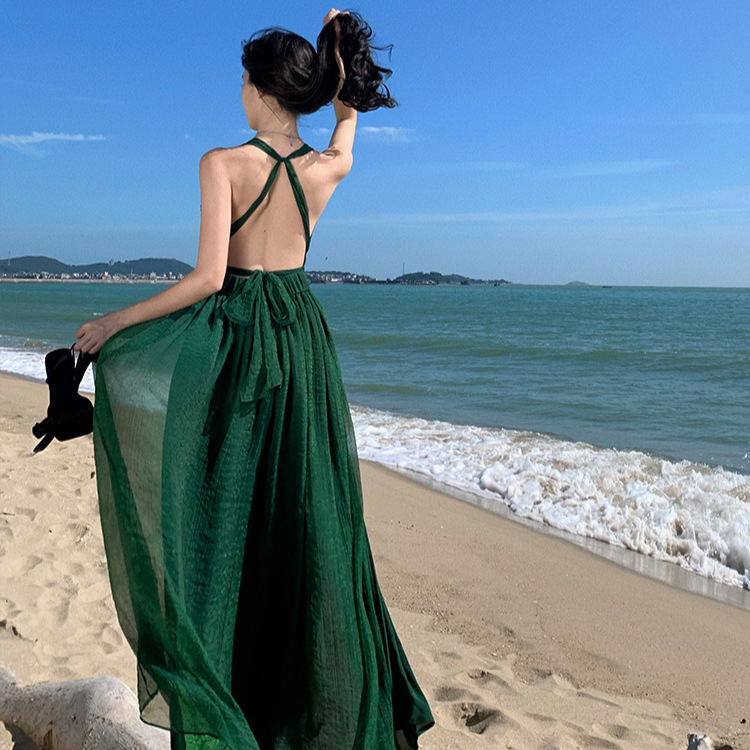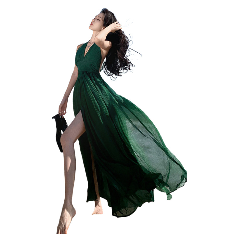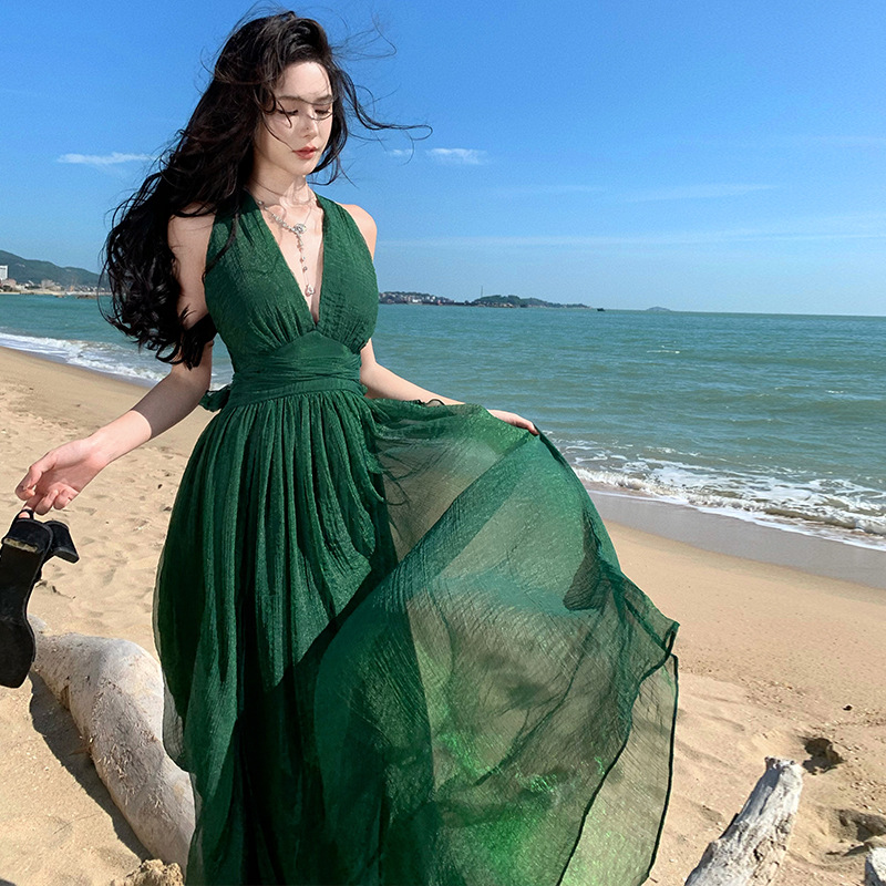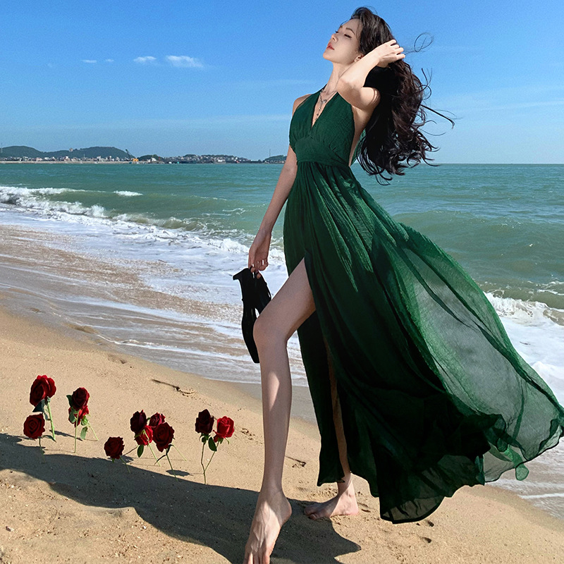 高品质海边度假绝美气质长裙深V领性感露背多种穿法超仙连衣裙子