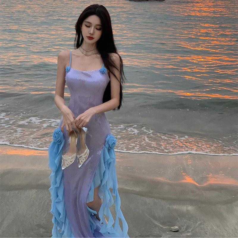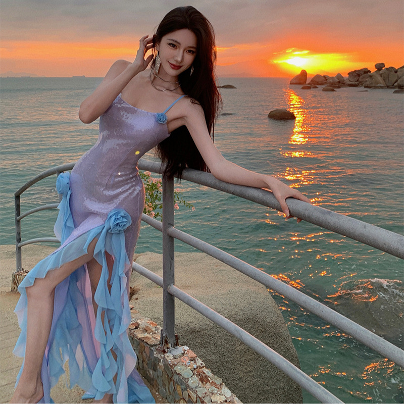 实拍欧美性感吊带亮片开叉连衣裙轻奢高级感夜店生日派对礼服裙子