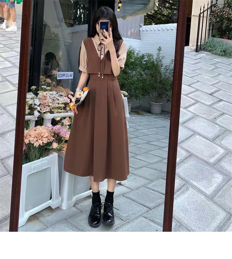 夏季学院风遮肉高腰拼接减龄中长裙大码胖mm套装裙假两件连衣裙女