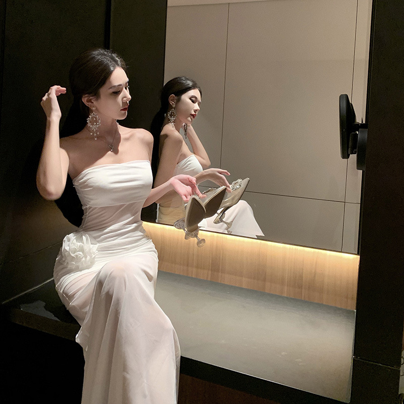 法式超仙度假风性感透视网纱花朵抹胸连衣裙女设计感修身气质长裙
