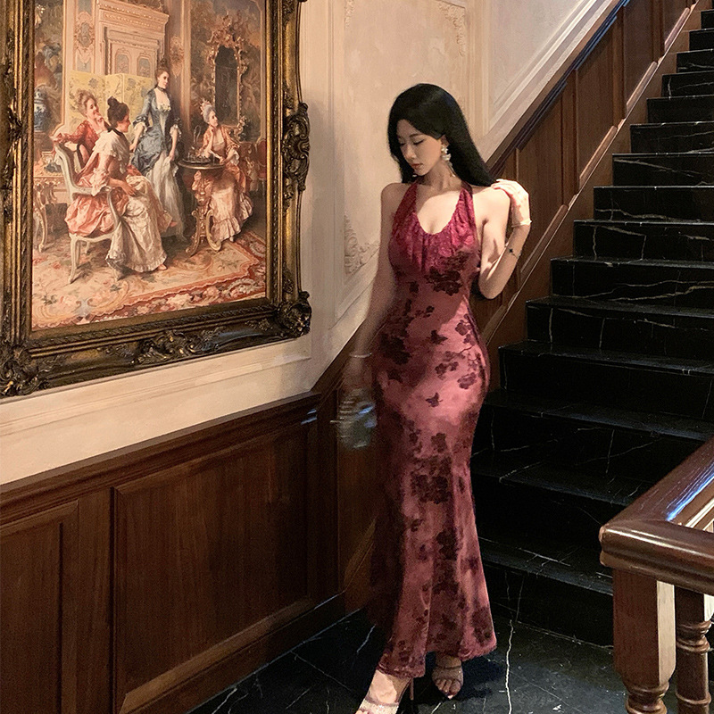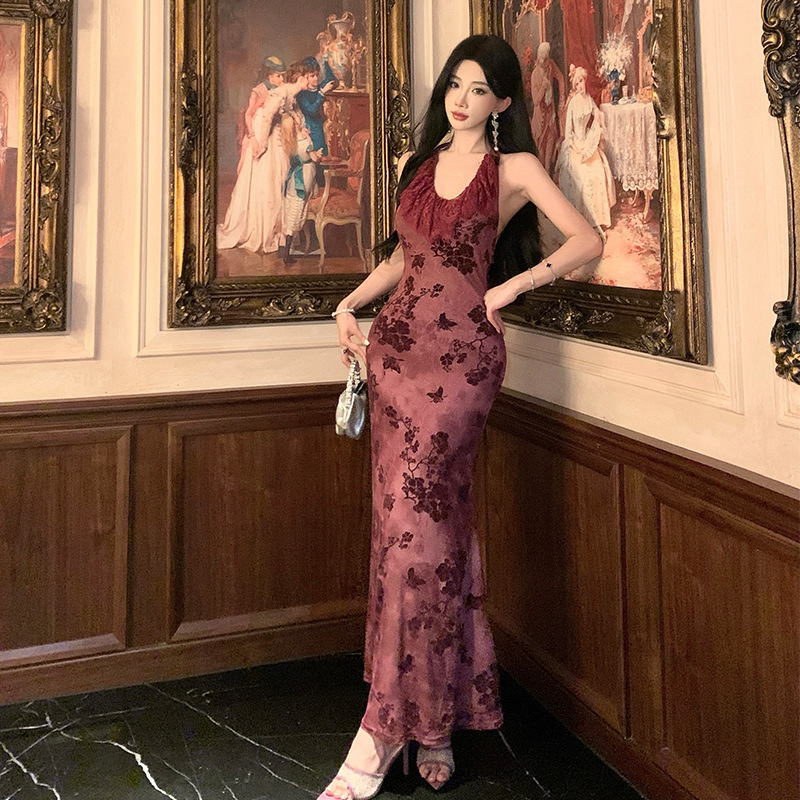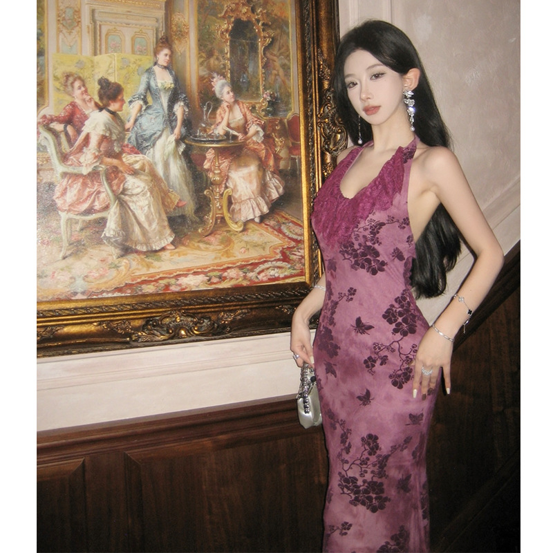 实拍扎染蕾丝网纱复古风紫色连衣裙显瘦鱼尾长裙年会礼服