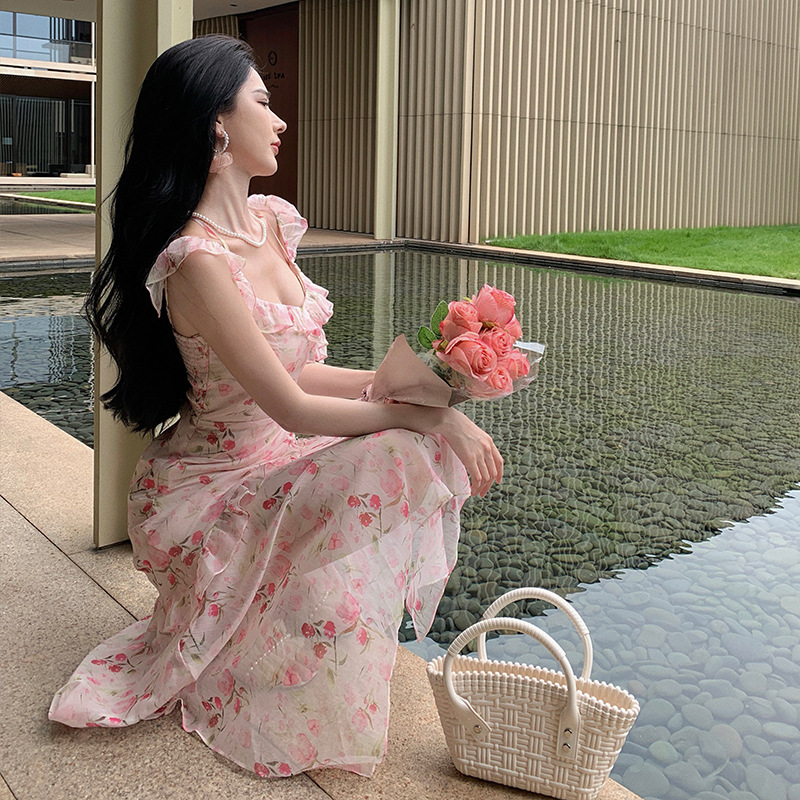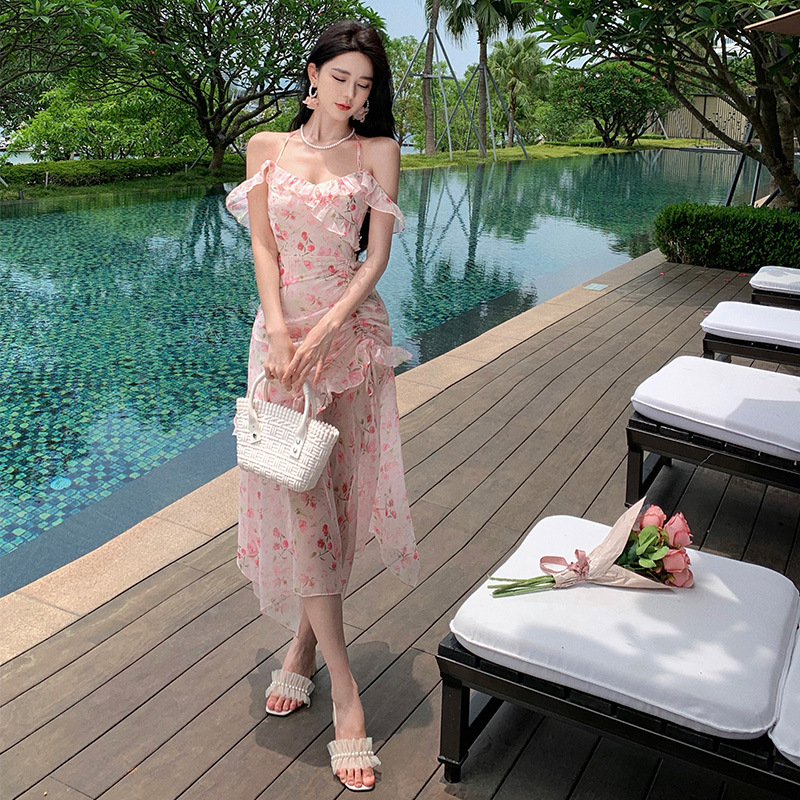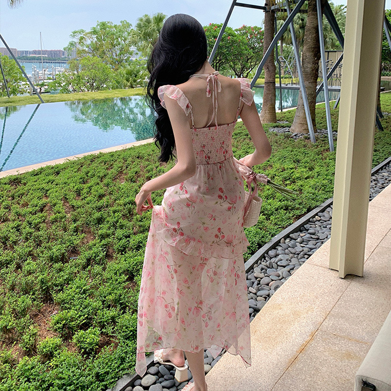 甜美碎花连衣裙女夏季设计感中长款荷叶边裙子