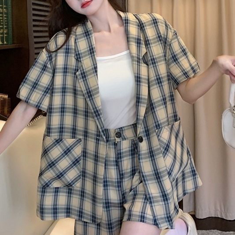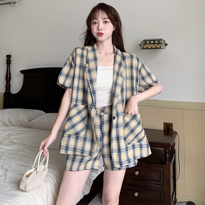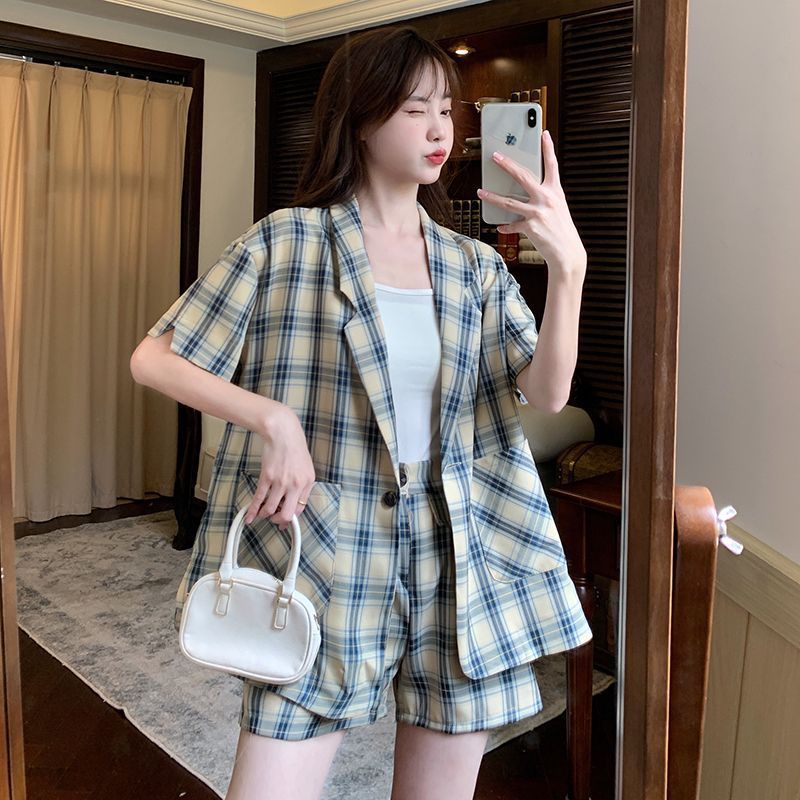 韩版小香风甜酷西装套装女夏季小个子西服外套阔腿短裤子两件套女