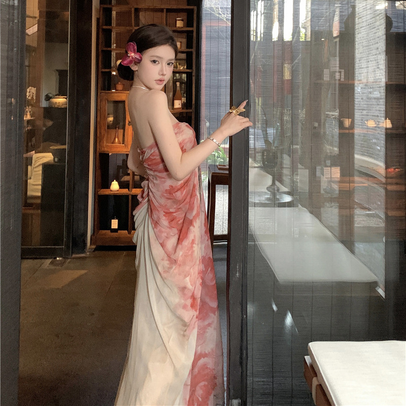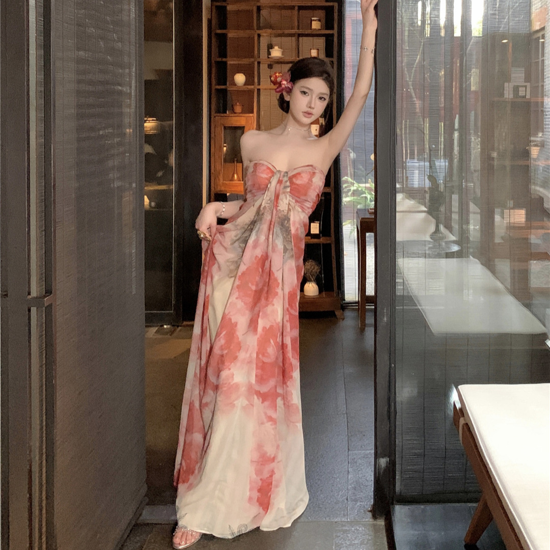 实拍繁花夏季新款气质显瘦小众高级扎染新中式抹胸连衣裙女长裙子