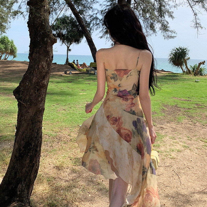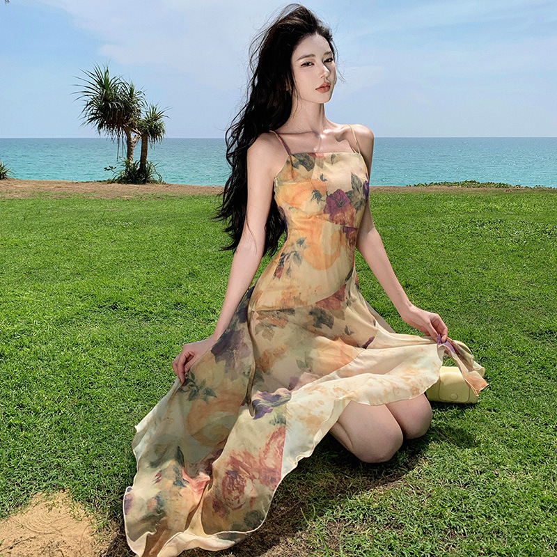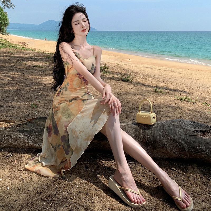 法式复古晕染印花鱼尾吊带裙女高级感别致惊艳短款连衣裙夏季新款