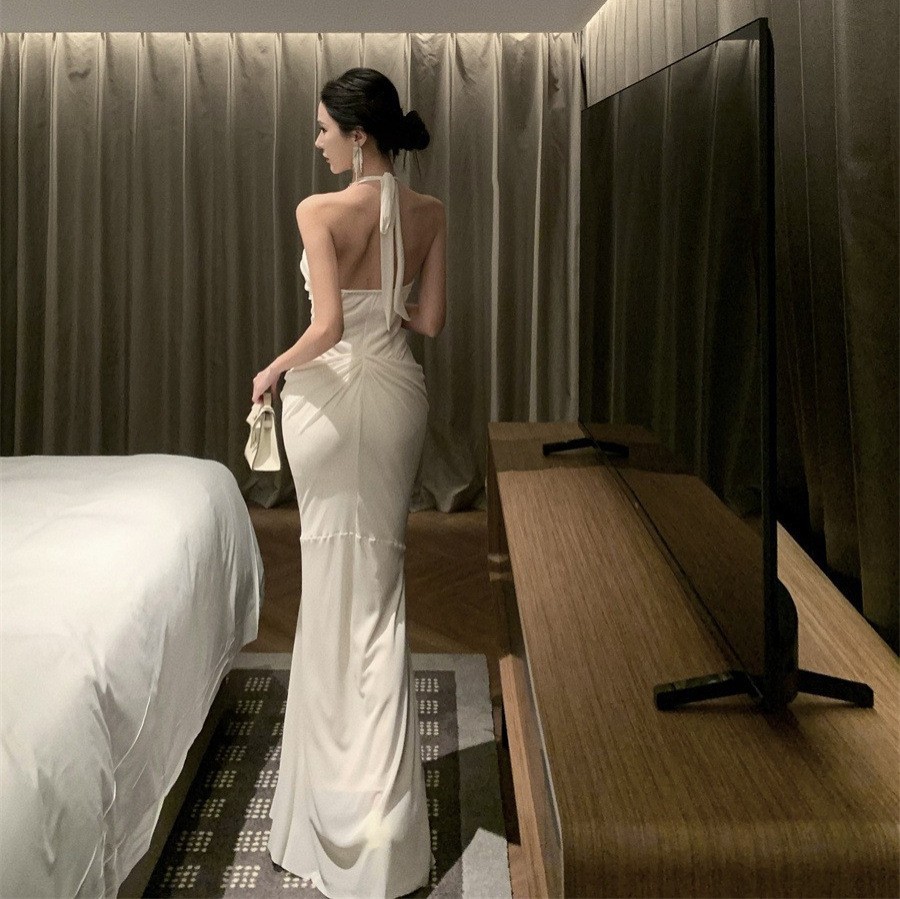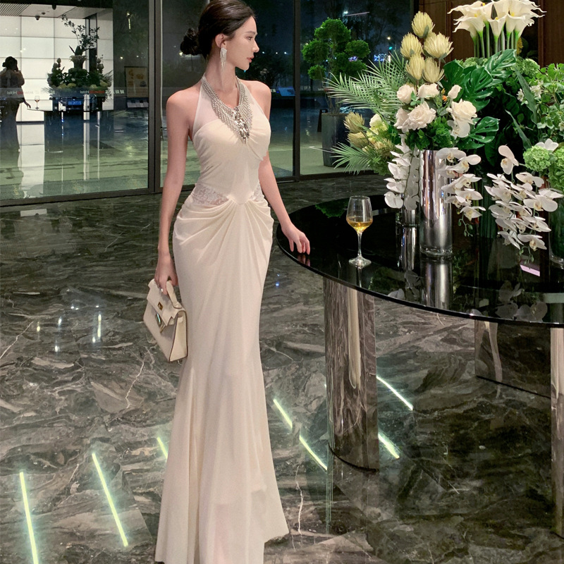 重工钉珠挂脖连衣裙女装秋季蕾丝拼接长裙子名媛风收腰鱼尾包臀裙