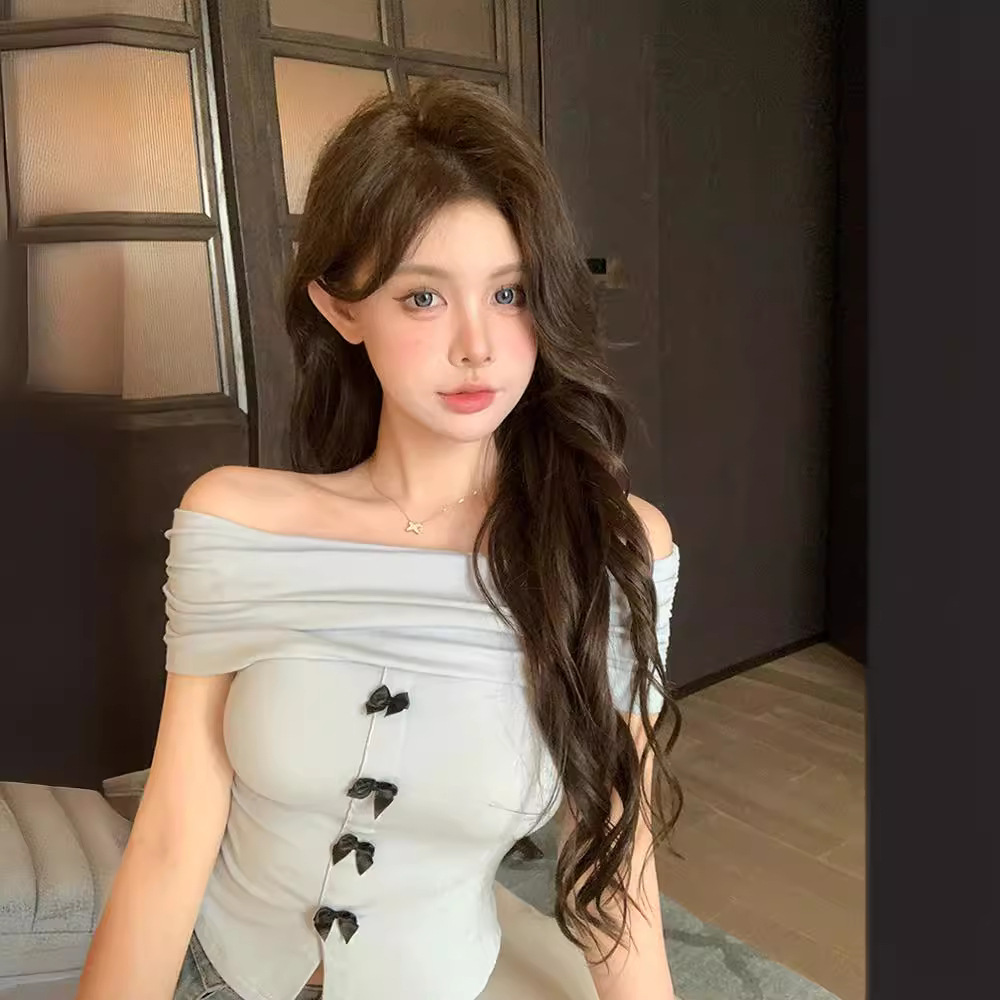 撞色蝴蝶结一字肩短袖T恤女夏季纯欲风性感修身短款开叉露肩上衣