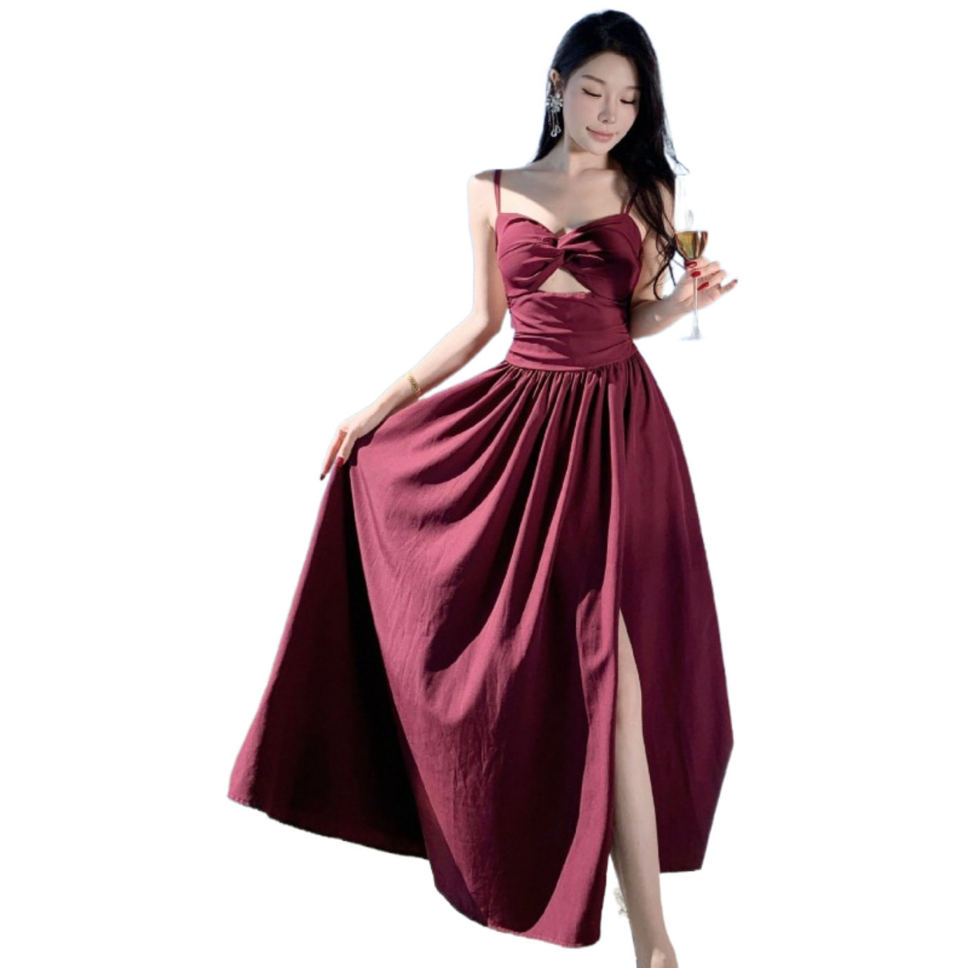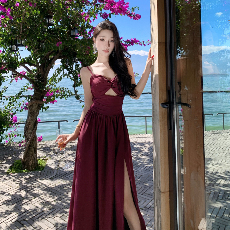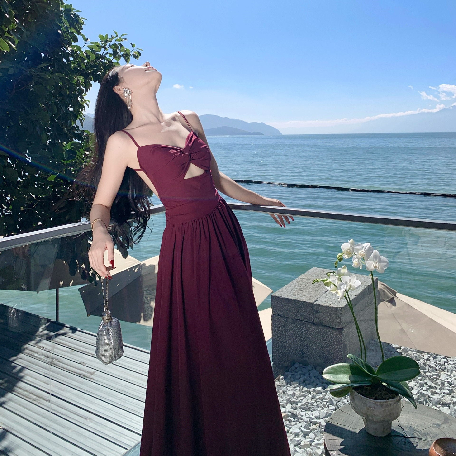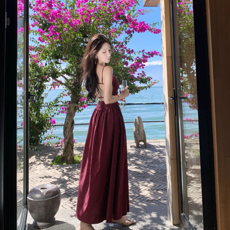 紫色露背吊带裙女夏季镂空性感收腰裙子海边度假裙大摆长款连衣裙