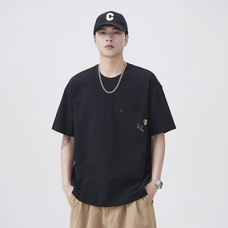 250g重磅纯棉宽松短袖t恤男圆领口袋刺绣男士黑色凉感上衣7a抗菌