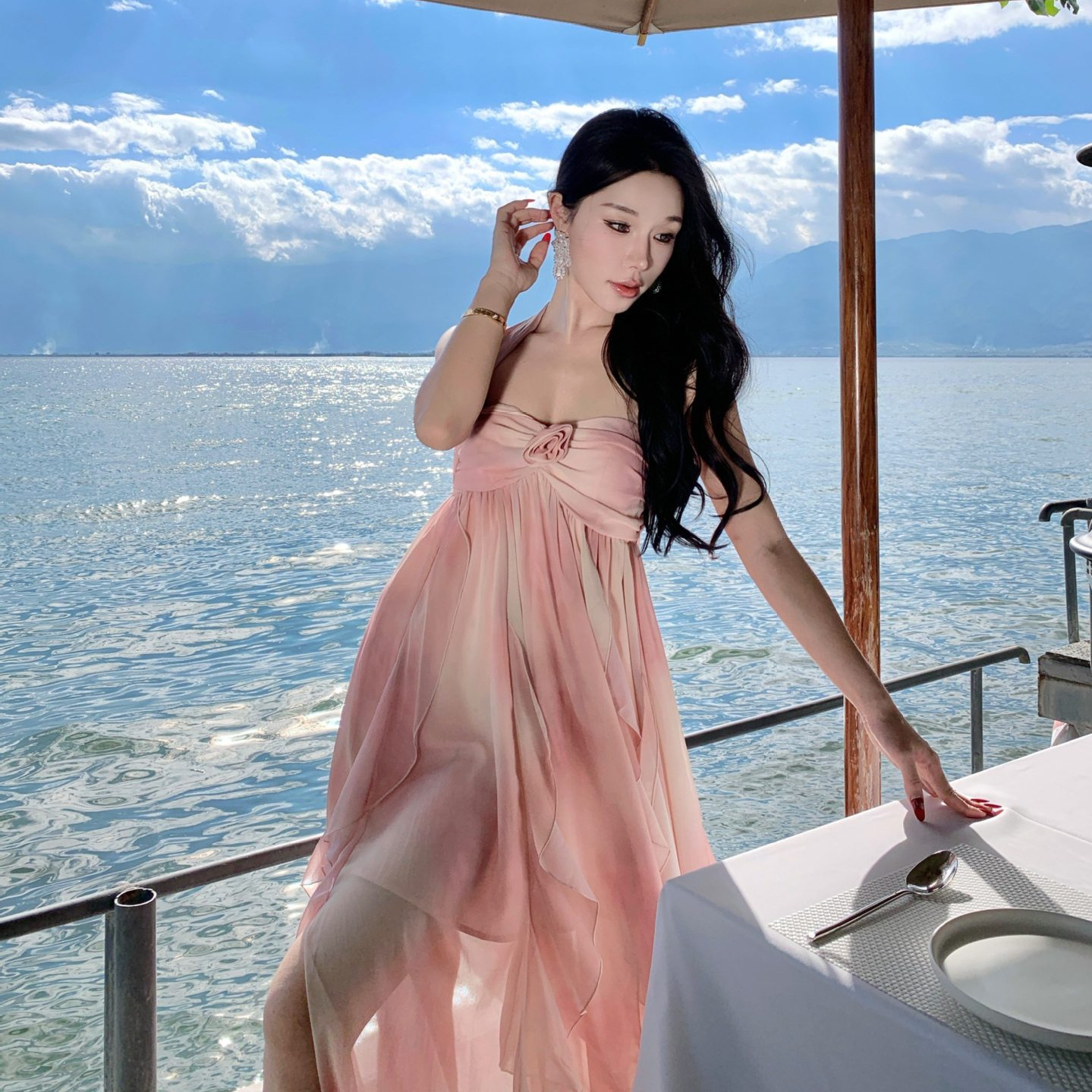 夏季海边度假挂脖粉色胸口立体玫瑰花长裙沙滩连衣裙海岛穿搭裙子