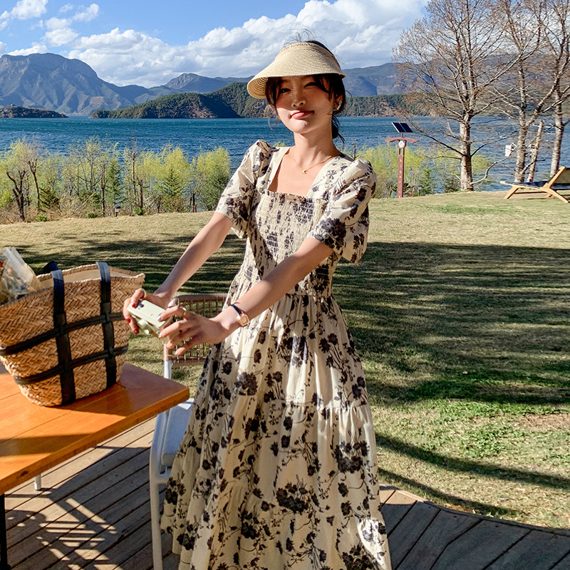 法式甜美少女方领短袖碎花连衣裙褶皱收腰气质长裙休闲印花茶歇裙