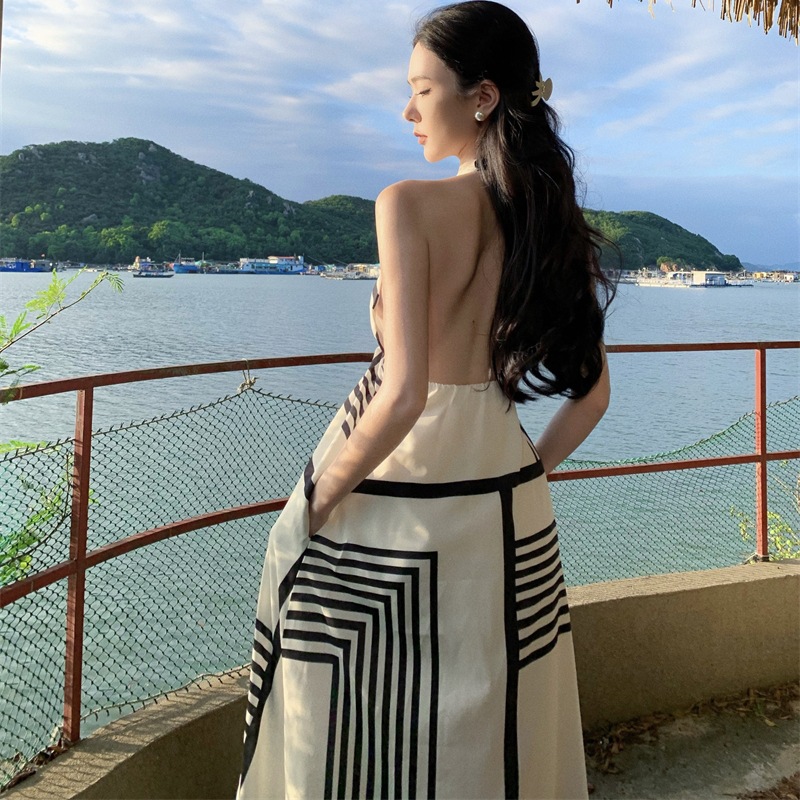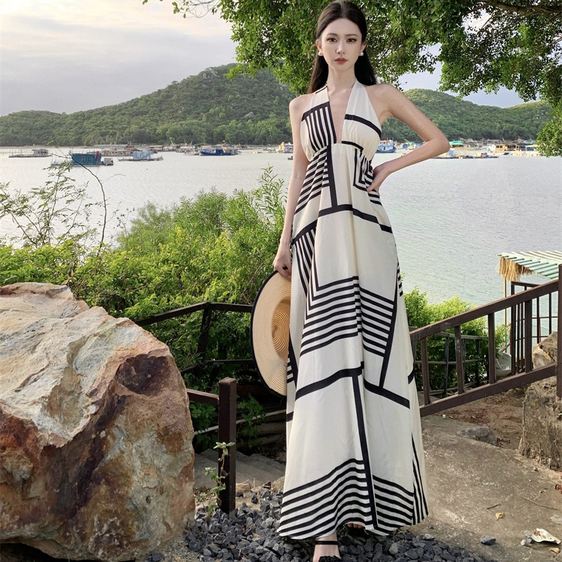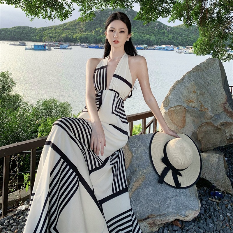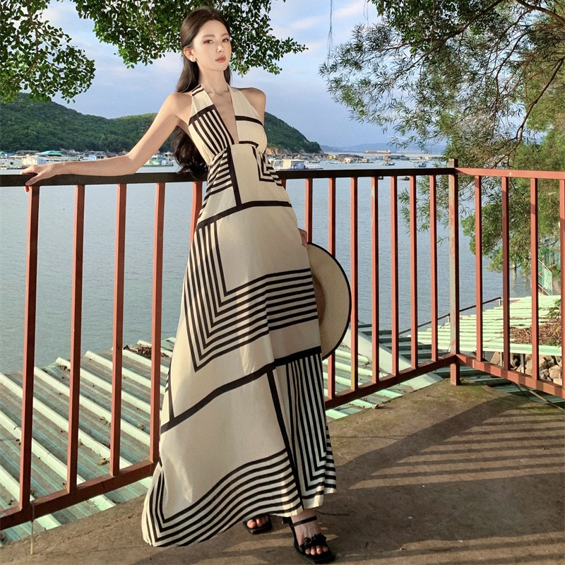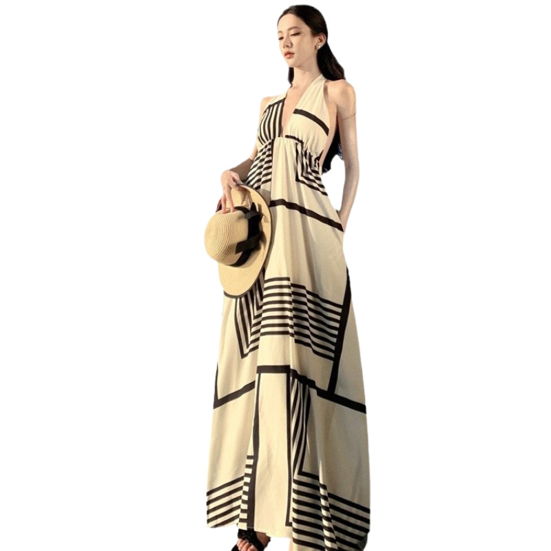 时尚宽松条纹府绸迷笛挂脖无袖连衣裙海岛度假穿搭性感露背长裙子