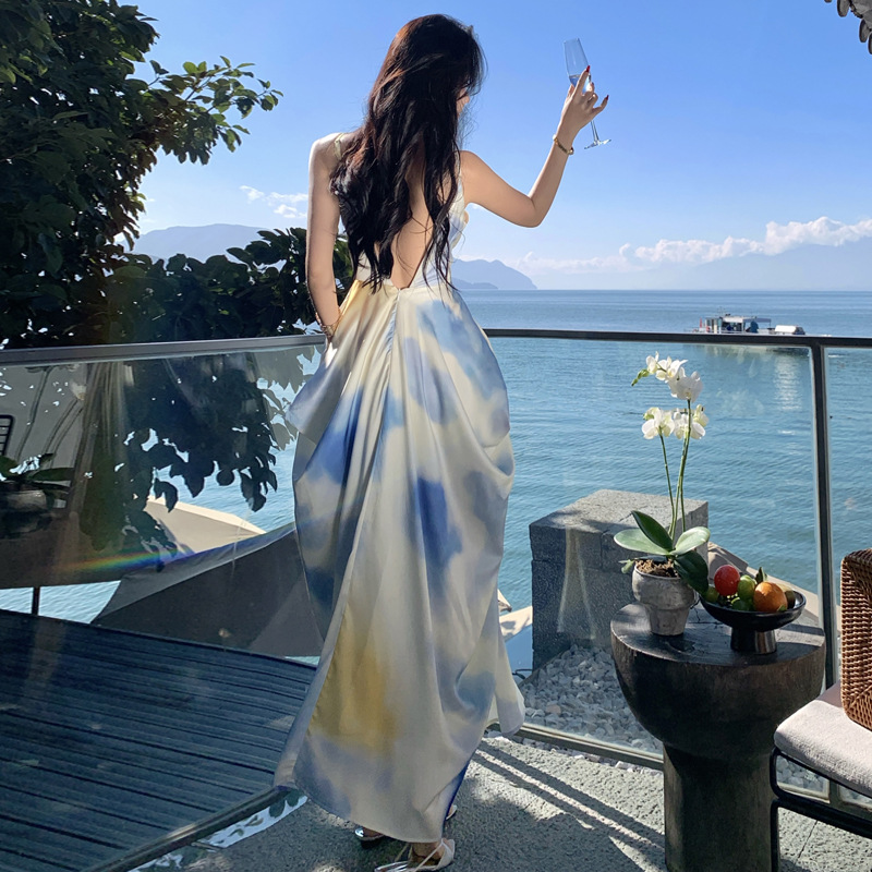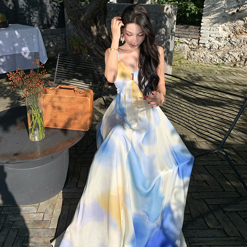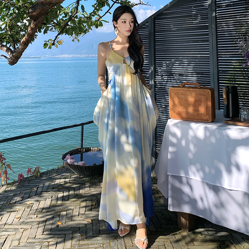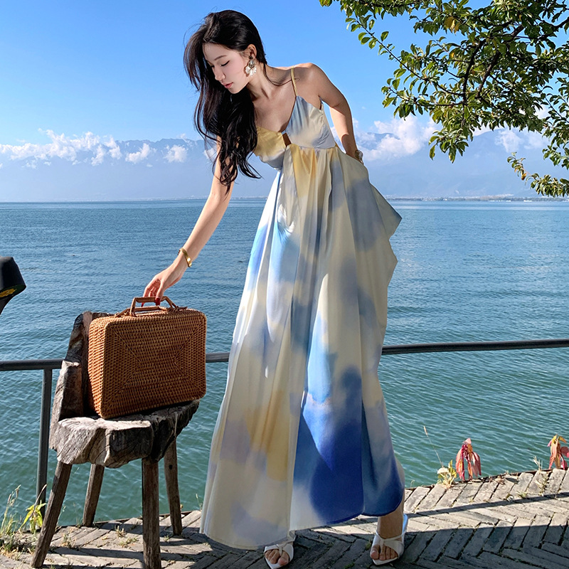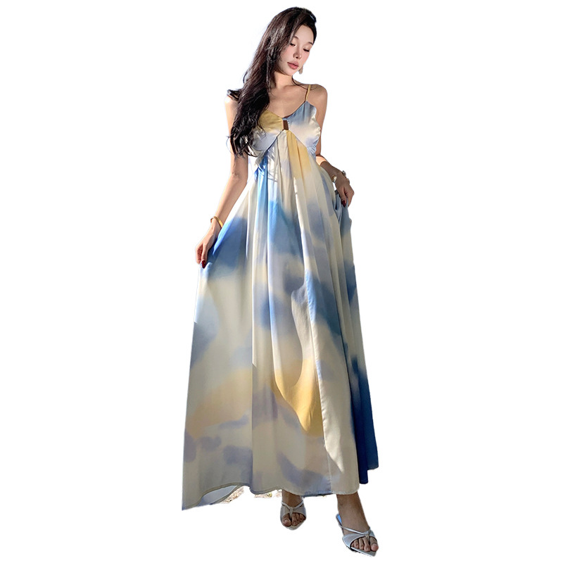 2025新款海岸落日度假风渐变晕染撞色印花气质连衣裙吊带裙长裙子